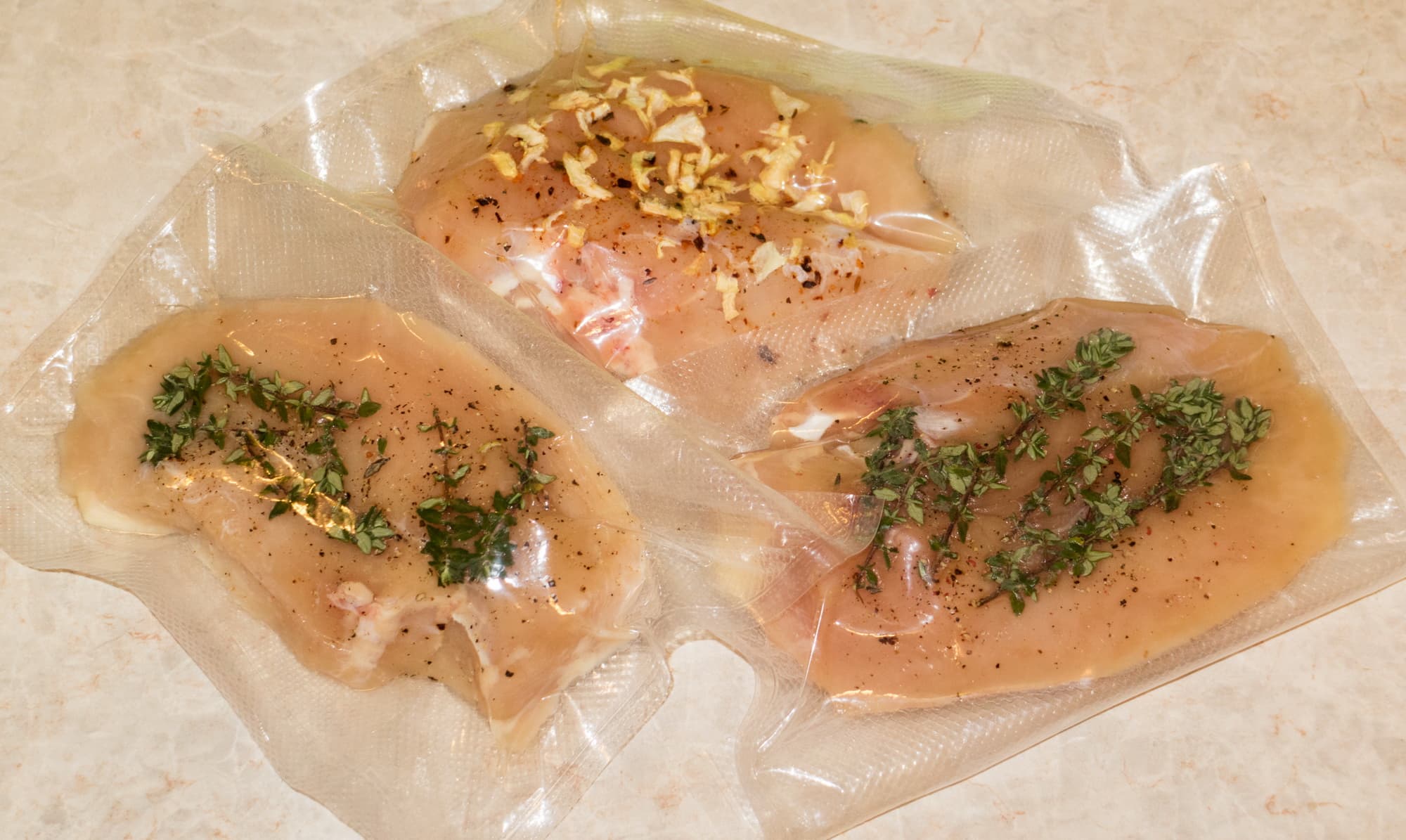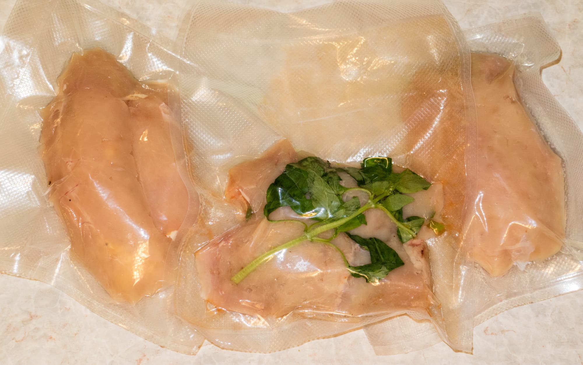 Вакуумирование происходило быстро и без проблем. Последний кусочек грудки готовили в су-виде через 6 дней после упаковки, а ели его спустя еще два дня — мясо сохранило свою свежесть и отлично пропиталась ароматами трав и специй.