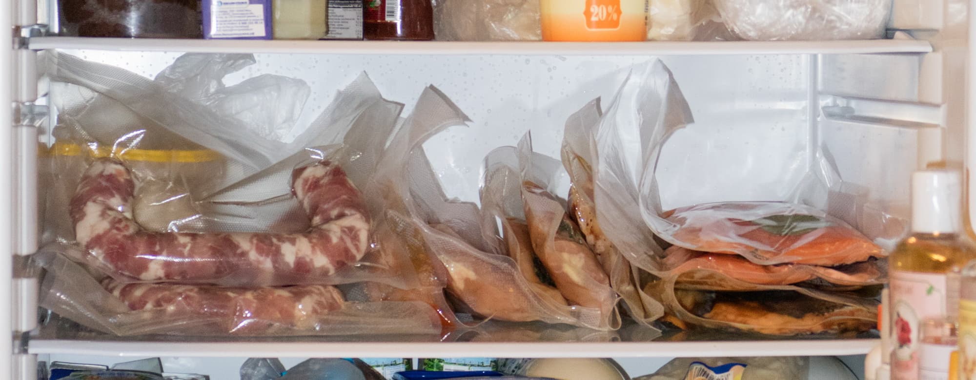 После окончания вакуумирования в пакете осталось немного воздуха. Мы связываем это со сложной формой упаковываемых продуктов. Поглядев на довольно быстро заполняющийся холодильник, мы убрали обрезки в морозильную камеру для хранения до более голодных времен. Думаем, что для хранения при низких температурах оставшиеся в пакете фрагменты воздуха не представляют опасности.