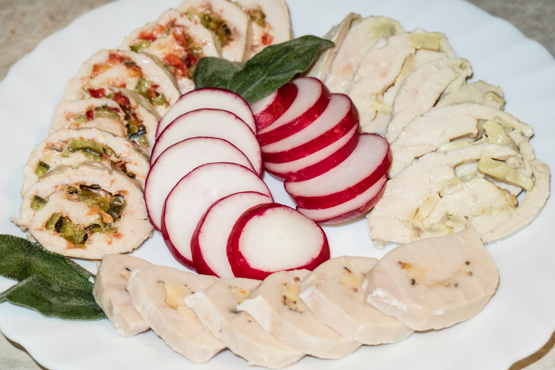 Для этого блюда мы разрезали грудку вдоль на две части, слегка отбили и выложили в центр разные начинки. Один рулет был сделан с сыром, второй — с грибами, третий — с копченой паприкой и свежим болгарским перцем. Затем аккуратно свернули рулеты и завакуумировали их.