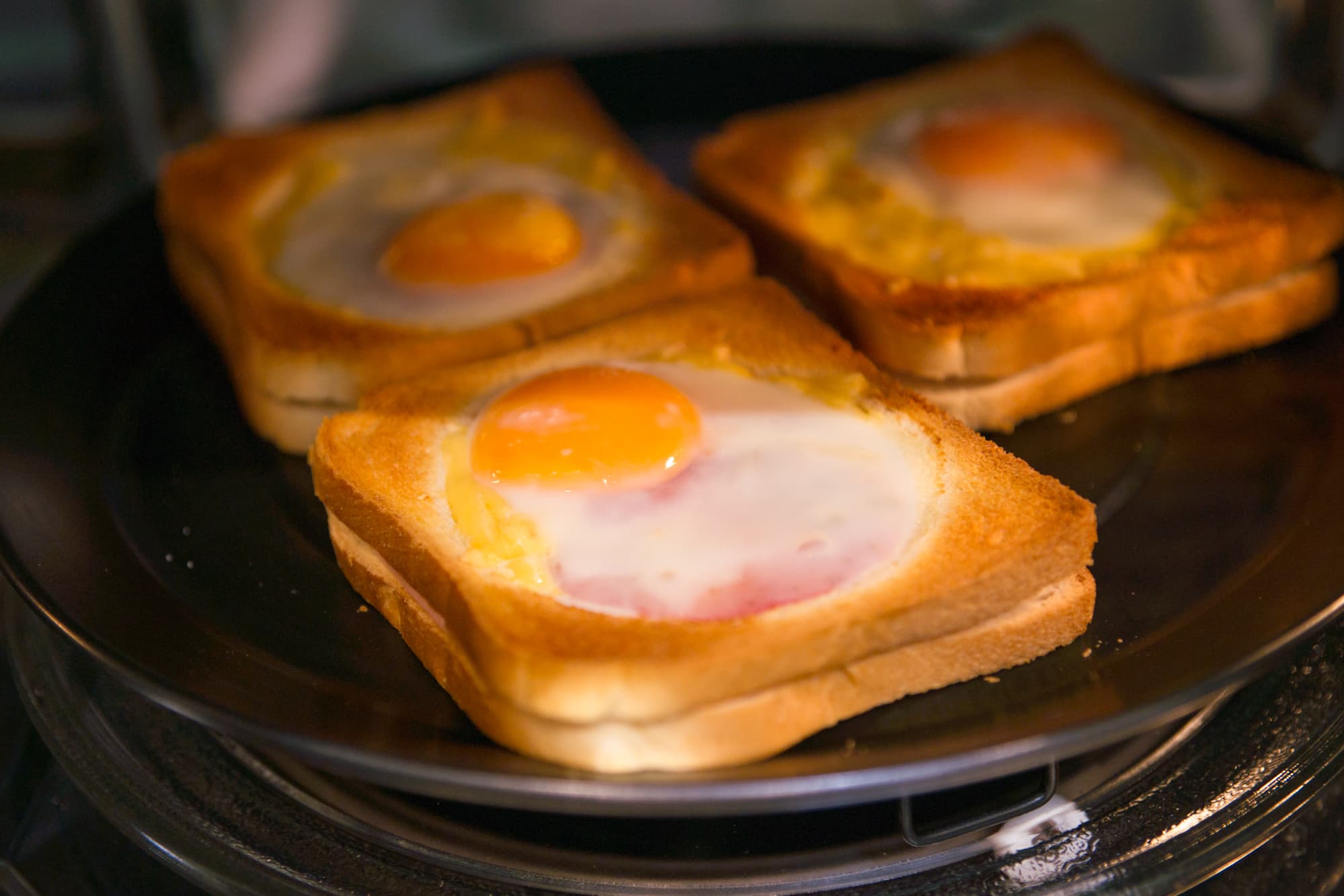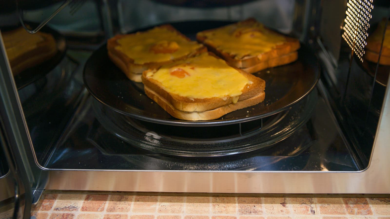 Первые 10 минут микроволновка работала в режиме Микроволны+Конвекция. За это время яичница в бутербродах успела приготовиться, а хлеб по краям аппетитно зарумянился.
