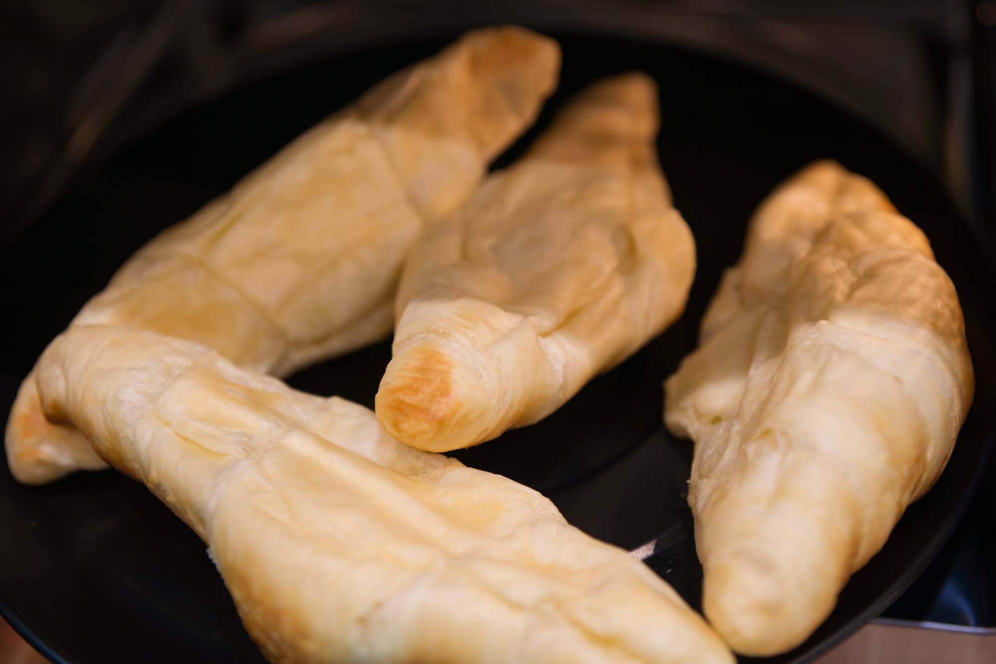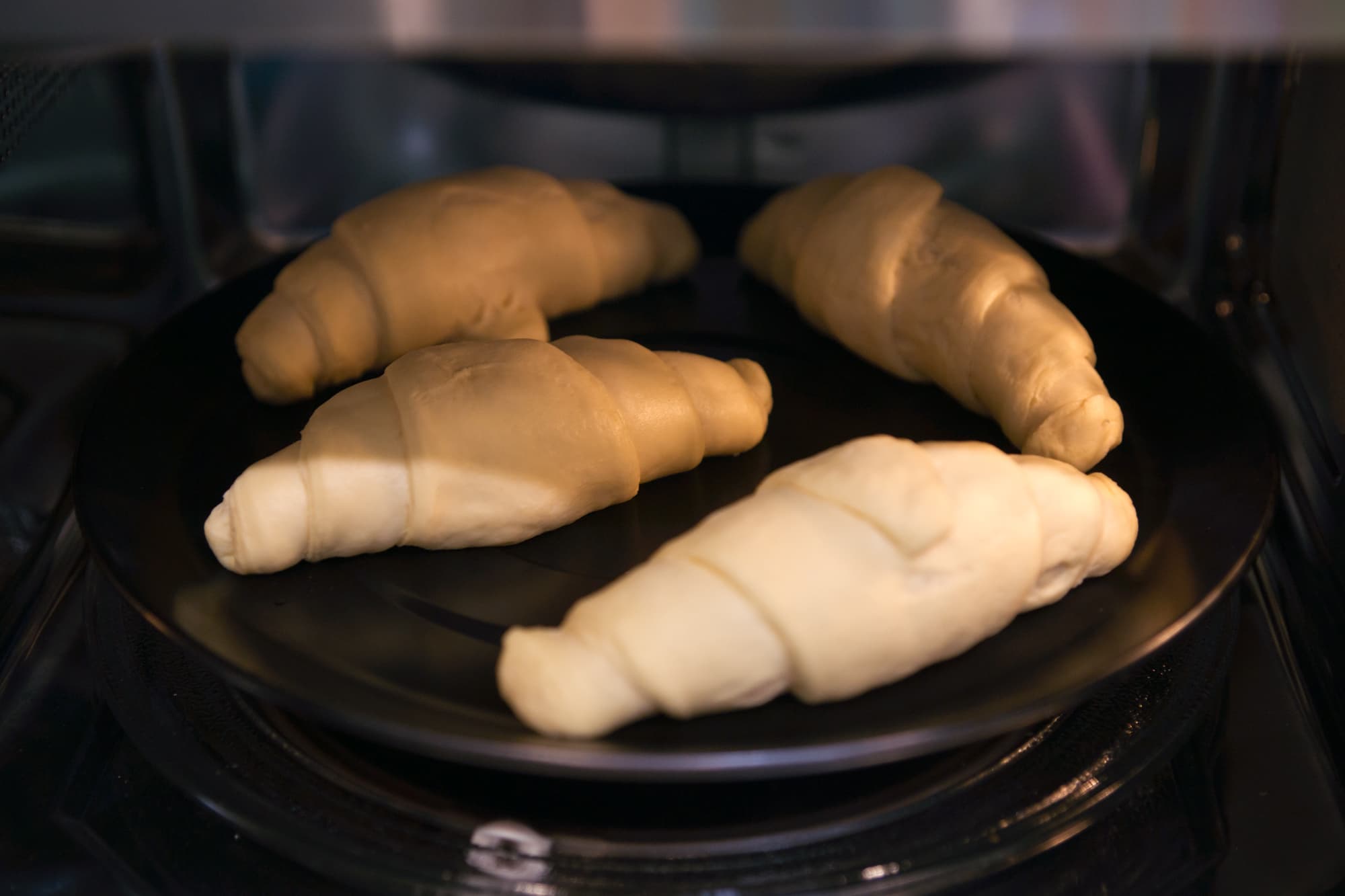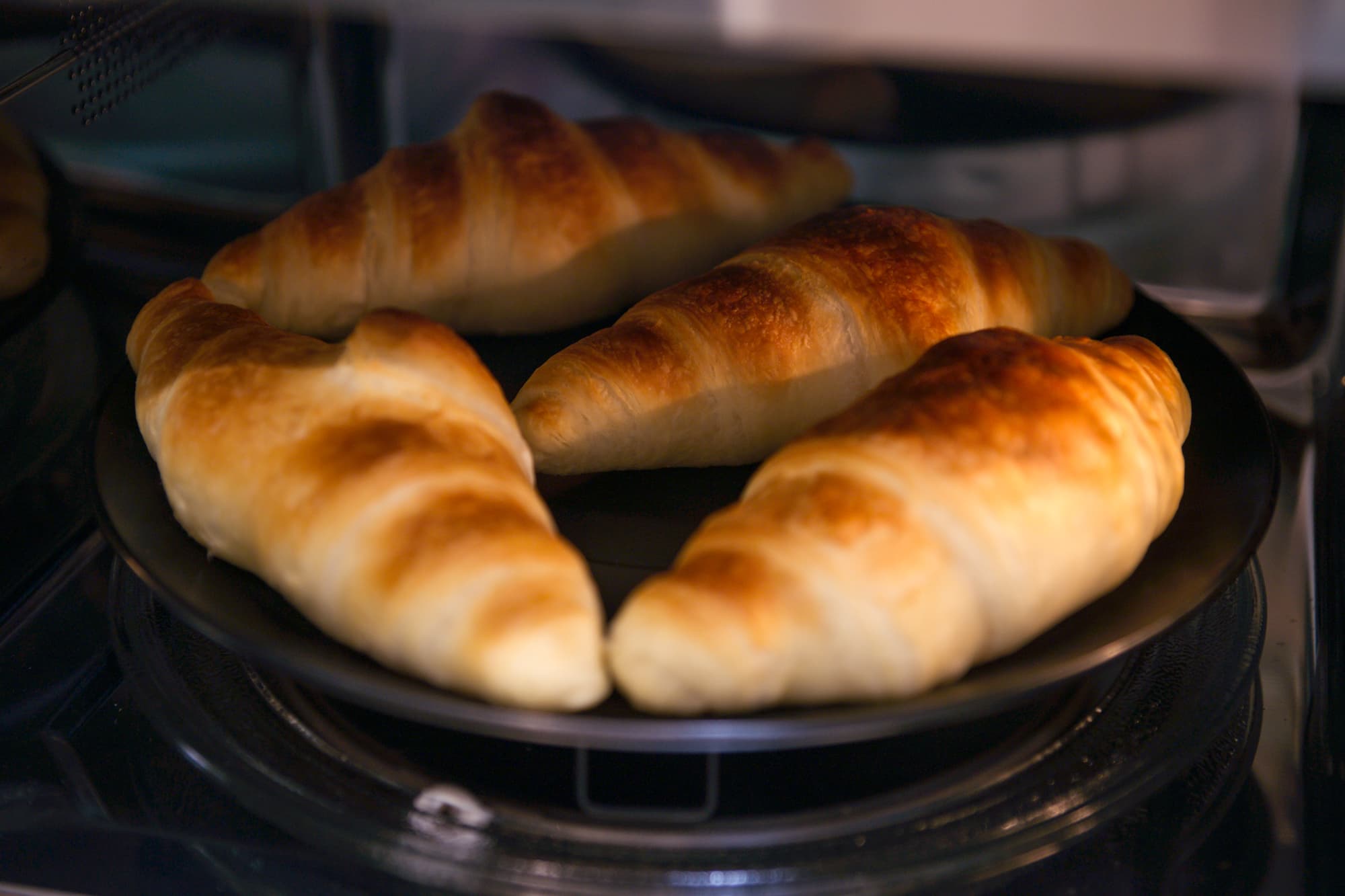 В следующий раз мы проверили работу печи без микроволн. Круассаны лучше выпекать в прогретой камере, поэтому сначала мы запустили печь в режиме предварительного нагрева до максимальной температуры в 200 °C. Перед выпеканием дали заготовкам из слоеного теста расстояться при комнатной температуре в течение часа. Как только прозвучал сигнал о достижении заданного уровня нагрева, отправили их в камеру на 20 минут.