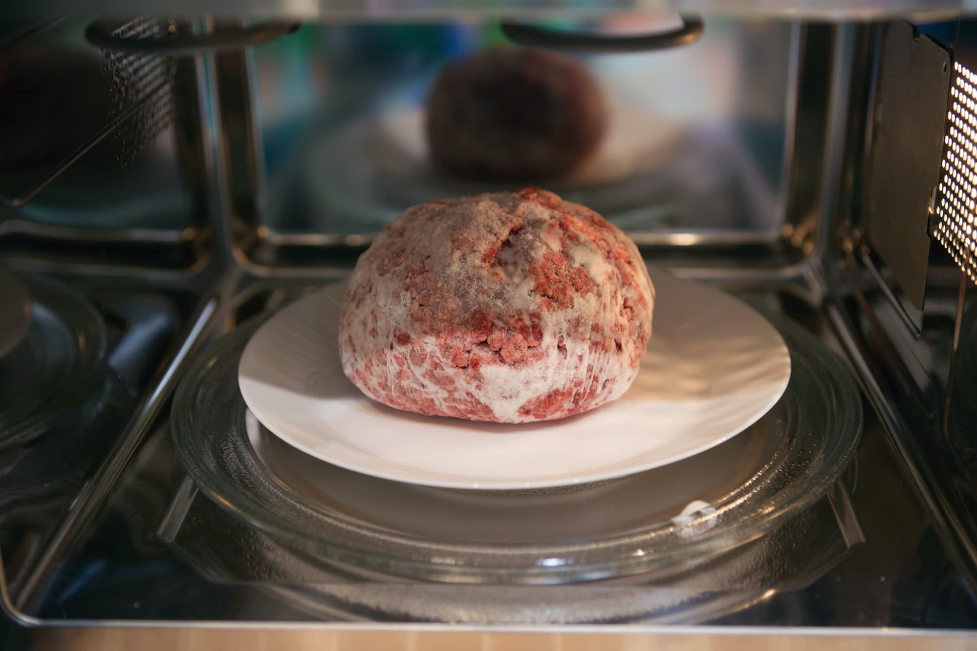 Первый раз проверили фарш через 5 минут. Мясо по-прежнему было сильно замороженным сверху, снизу же стало помягче и нам удалось снять 170 г. Еще через 5 минут легко снялось уже 380 г. На 15-й минуте мы вновь заглянули в камеру и проверили фарш — оставшийся кусок полностью разморозился.