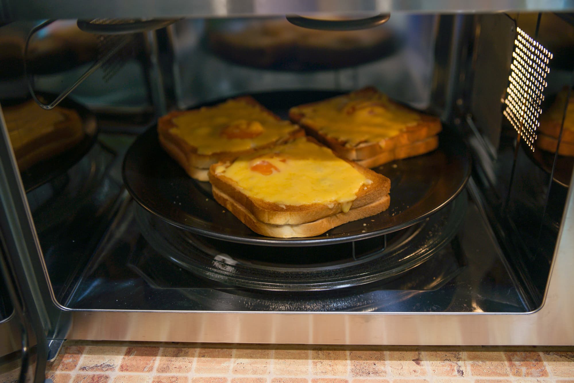 Достали тарелку, присыпали бутерброды тертым сыром и вернули в камеру на режим Гриль еще на 5 минут.