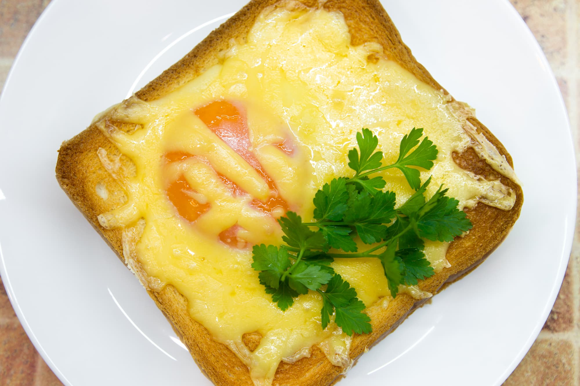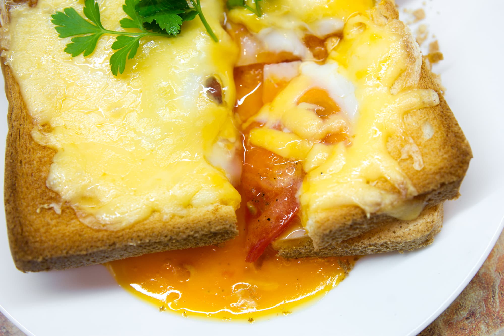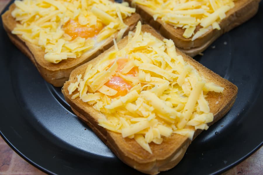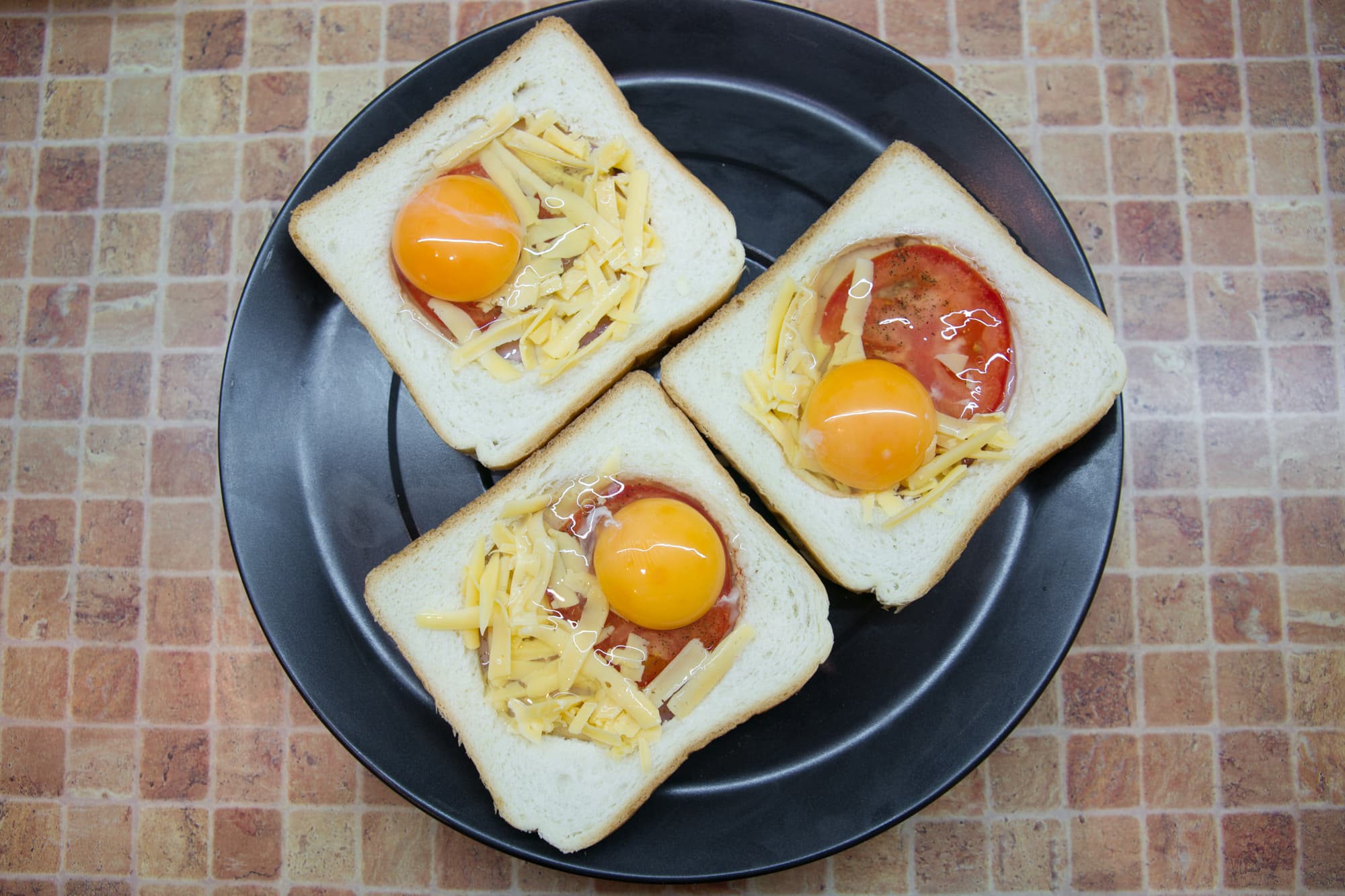 На тостовый хлеб положили сыр, сверху ветчину, помидор, накрыли еще одним ломтиком хлеба с вырезанной серединой, добавили по одному яйцу, присыпали небольшим количеством соли, свежемолотого черного перца и тертого сыра и отправили бутерброды в камеру.