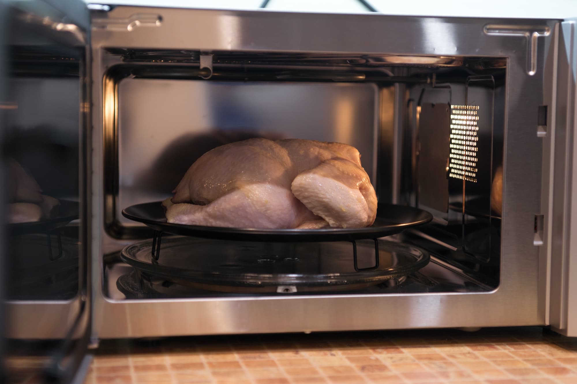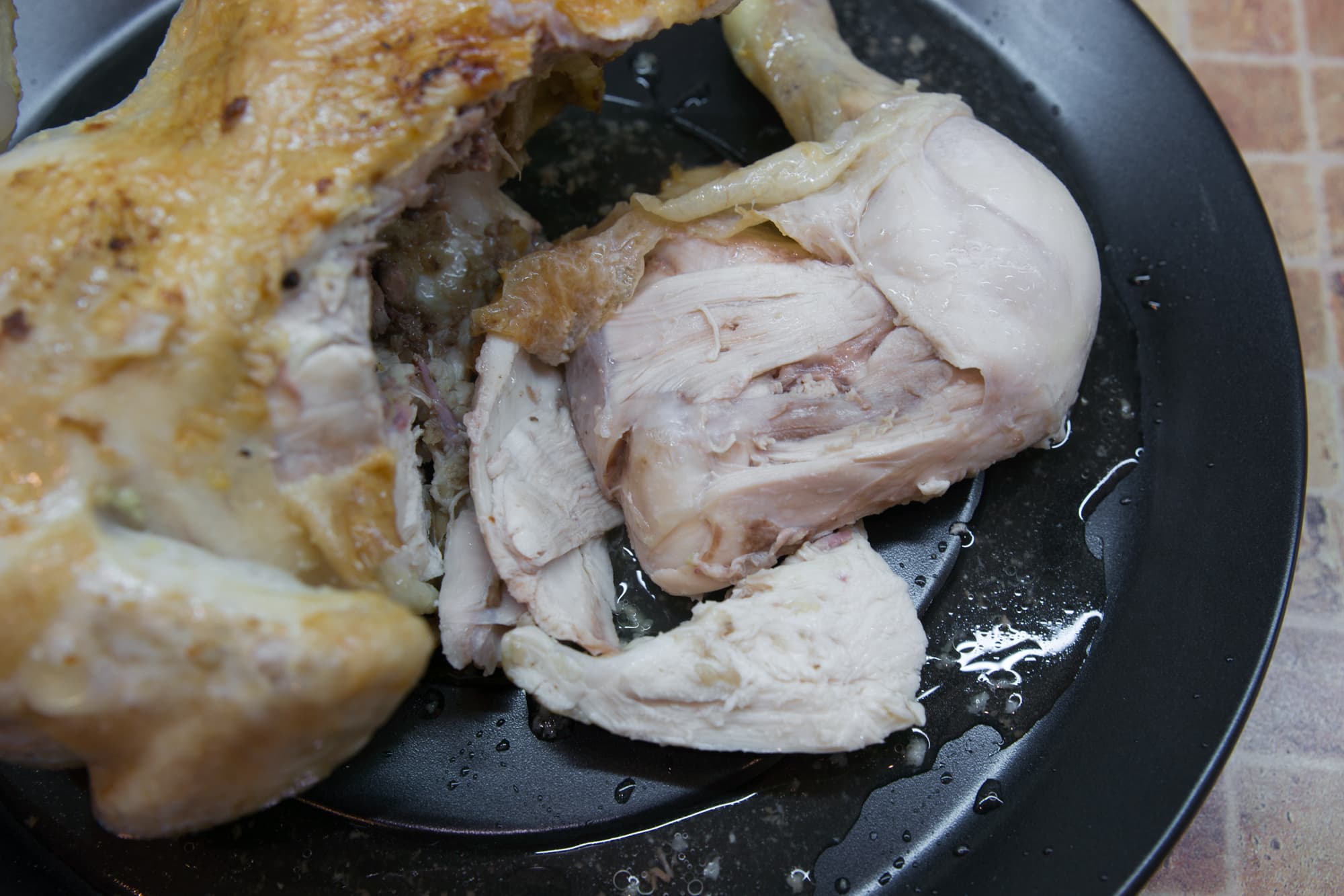 Примерно за 10 минут до окончания программы мы проверили содержимое блюда. Курица уже неплохо запеклась, но в емкости обнаружилось много бульона, который не дал бы корочке снизу качественно поджариться. Мы слили жидкость, перевернули птицу и отправили обратно в камеру. Как только микроволновка оповестила об окончании программы, мы снова достали блюдо, еще раз перевернули курицу и поставили обратно, добавив 15 минут в режиме Микроволны+Гриль. Это позволило еще немного подсушить корочку сверху. Курица приготовилась равномерно, получилась сочной и не пересушенной.