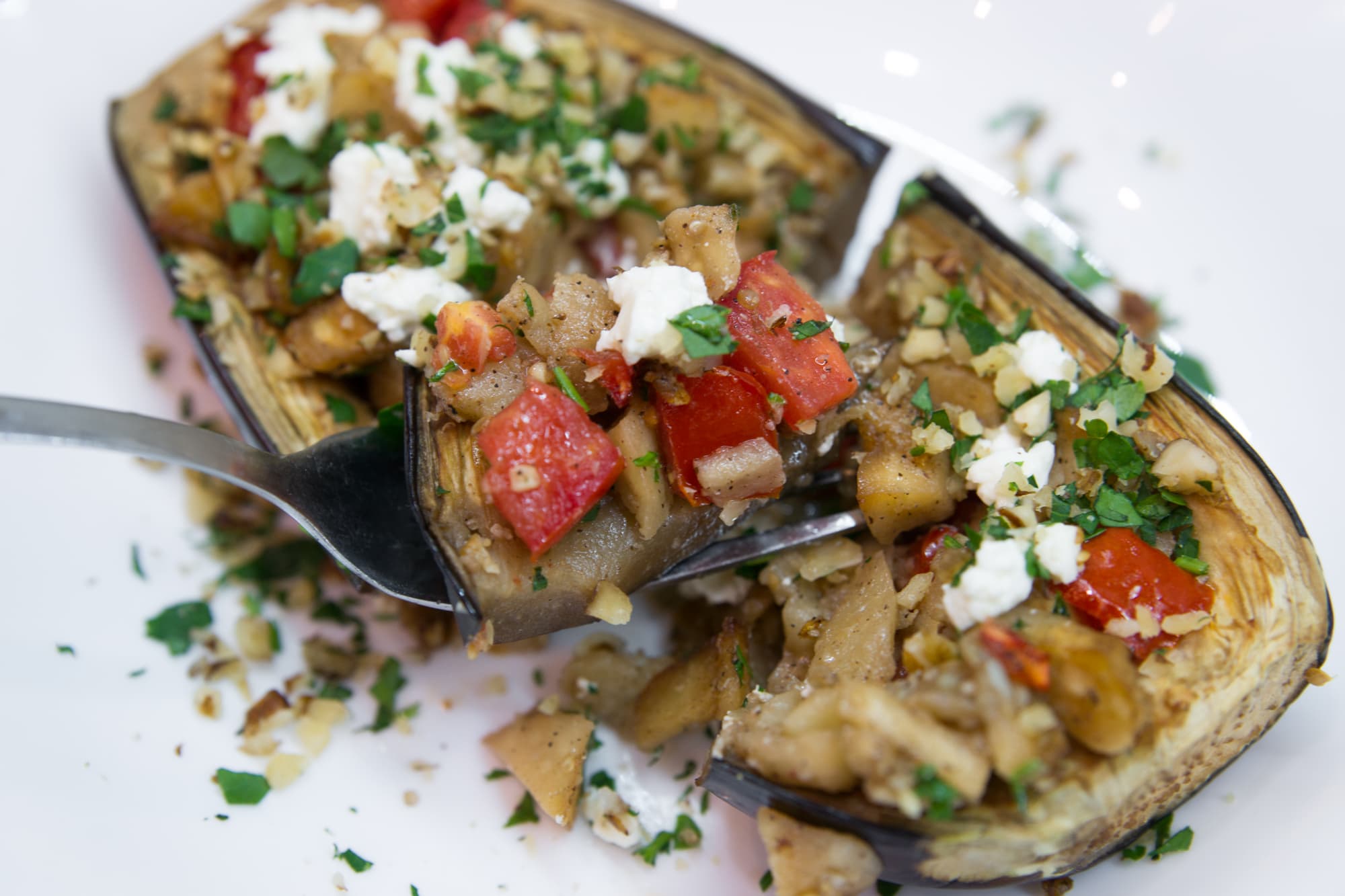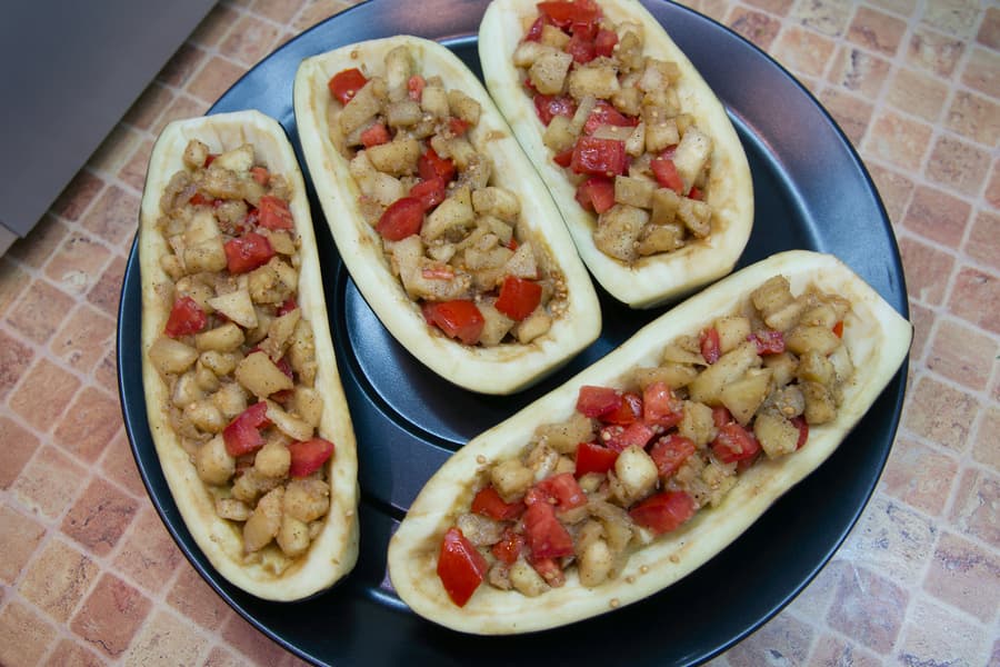 Пару крупных баклажанов разрезали пополам и вынули мякоть, стараясь не повредить шкурку. Нарезали ее на мелкие кубики, добавили измельченный помидор, растительное масло, соль со специями и перемешали. Нафаршировали баклажаны и разместили их на тарелке.