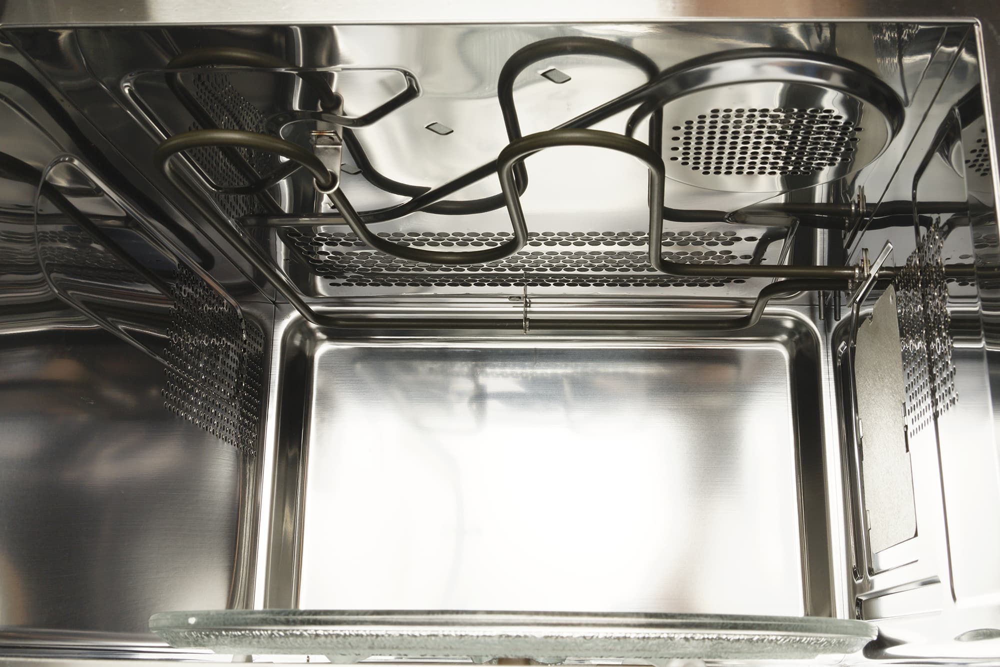 Справа за слюдяной пластиной размещен волновод. На потолке камеры мы видим открытый тэн, за решеткой — гриль, а рядом за перфорированной круглой панелью прячется вентилятор конвекции.