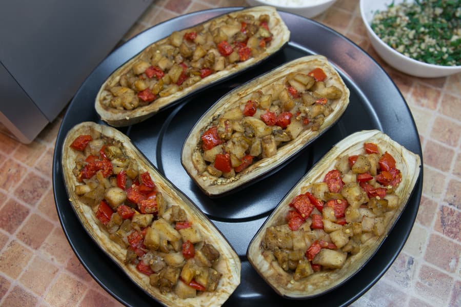 Затем добавили в начинку размятую вилкой брынзу и вернули в камеру еще на 15 минут. Перед дегустацией присыпали овощи зеленью и грецкими орехами.