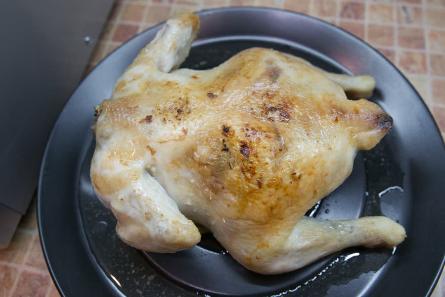 В этом тесте мы воспользовались авторежимом №7, предназначенным специально для запекания курицы. С учетом веса нашей птицы в 1200 г печь автоматически выставила 39 минут. Перед приготовлением мы смазали курицу растительным маслом и солью.