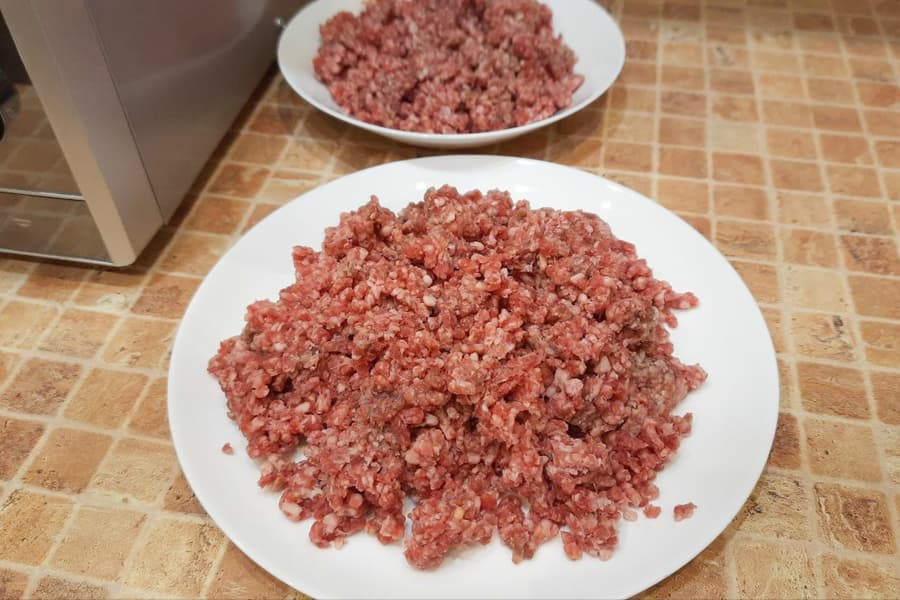Традиционно, тестирование мы начинаем с размораживания фарша, изготовленного из говядины и свинины средней жирности в пропорции 50 на 50. Вес замороженного комка — 800 г.