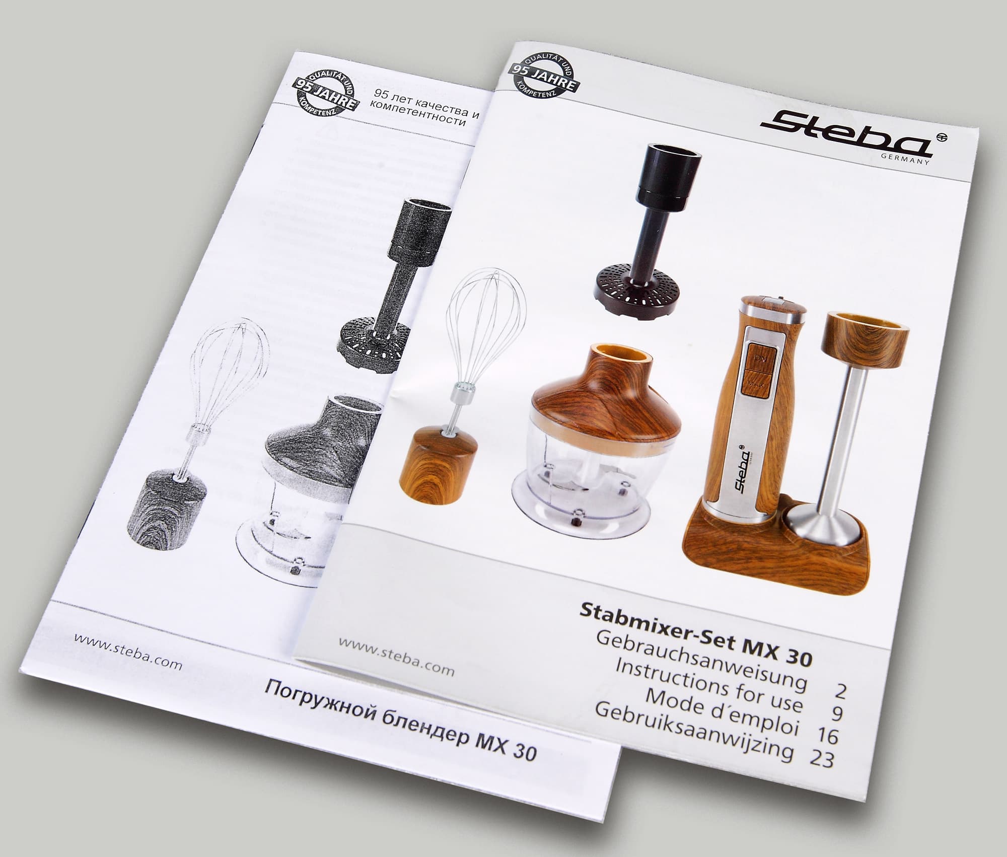 В комплект блендера Steba MX-30 входили две брошюры. Одна, потолще, выполненная на глянцевой плотной бумаге и с цветными иллюстрациями — это инструкция по эксплуатации. Информация в ней представлена на четырех языках, русского среди которых нет. Вторая брошюрка, состоящая из четырех листов, представляет собой перевод «большой» инструкции. Соответственно, информация в брошюре представлена только на русском языке. В тексте даны указания по безопасности, рекомендации по чистке и уходу за прибором, по сборке и использованию различных насадок. Ни технических характеристик (кроме количества оборотов в минуту при работе на максимальной и минимальной скоростях), ни схемы блендера, ни гарантийных обязательств в инструкции по эксплуатации нет. В разделе, посвященном различным насадкам, входящим в комплект, даются рекомендации по использованию сырья и скорости его переработки.