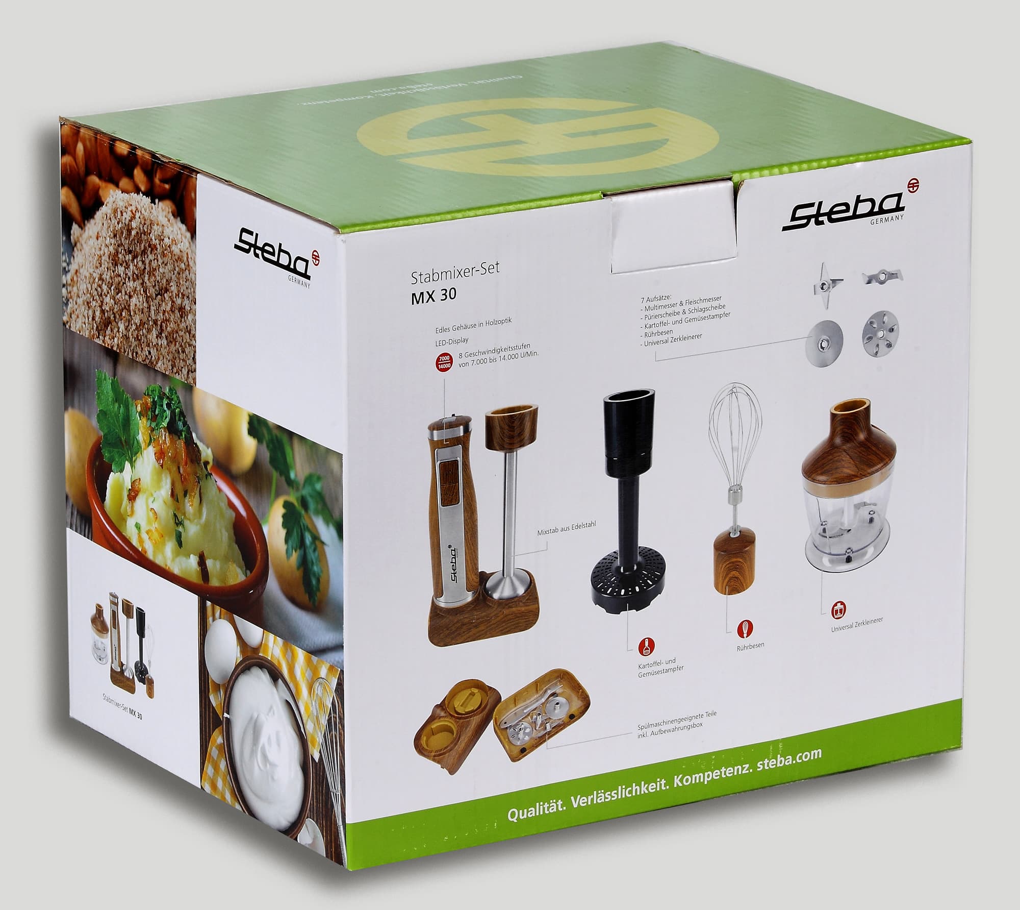 Сегодня мы рассмотрим многофункциональный ручной погружной блендер, который не только измельчает, взбивает и смешивает. Также Steba MX-30 может пюрировать овощи, готовить эмульсии и измельчать орехи. Многие производители выпускают идентичные по функциям приборы, и как показали наши тесты, устройства подобного типа не сильно отличаются друг от друга. Да, отличия есть, но они заключаются, как правило, в мощности, форме ножа и размере погружной головки. В данной статье мы приведем результаты визуального осмотра Steba MX-30, опишем наши впечатления от эксплуатации, а также выявим преимущества и недостатки данного устройства.