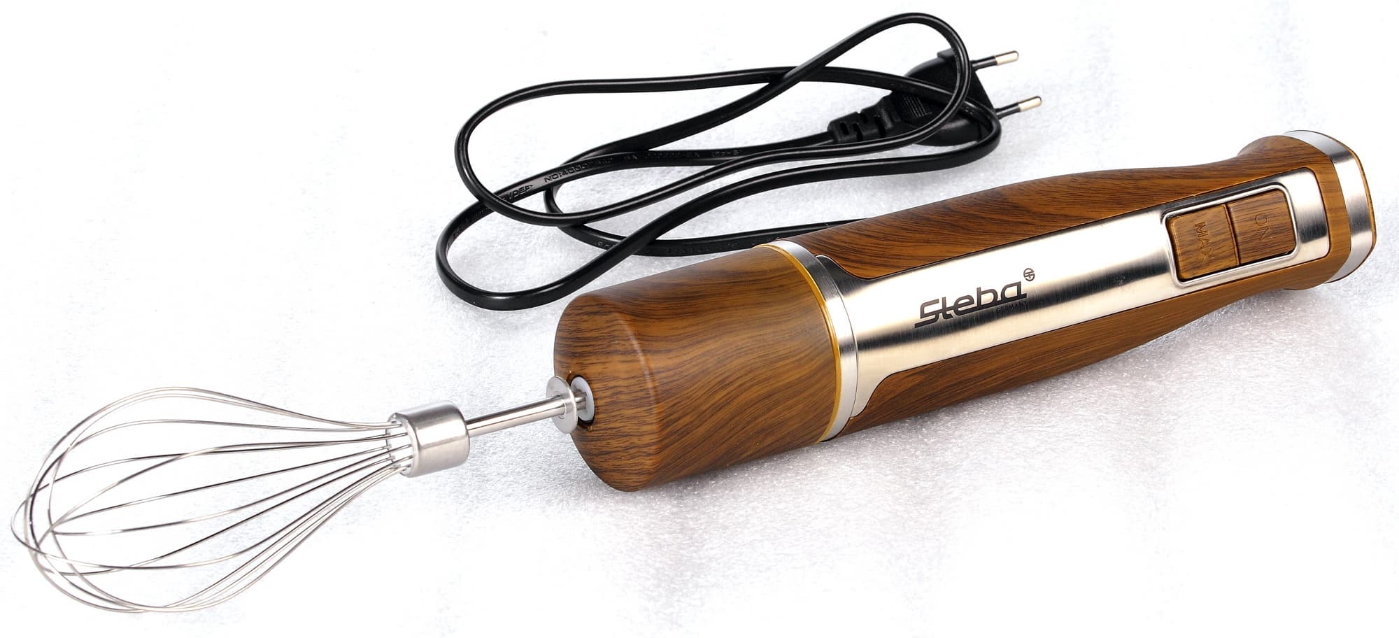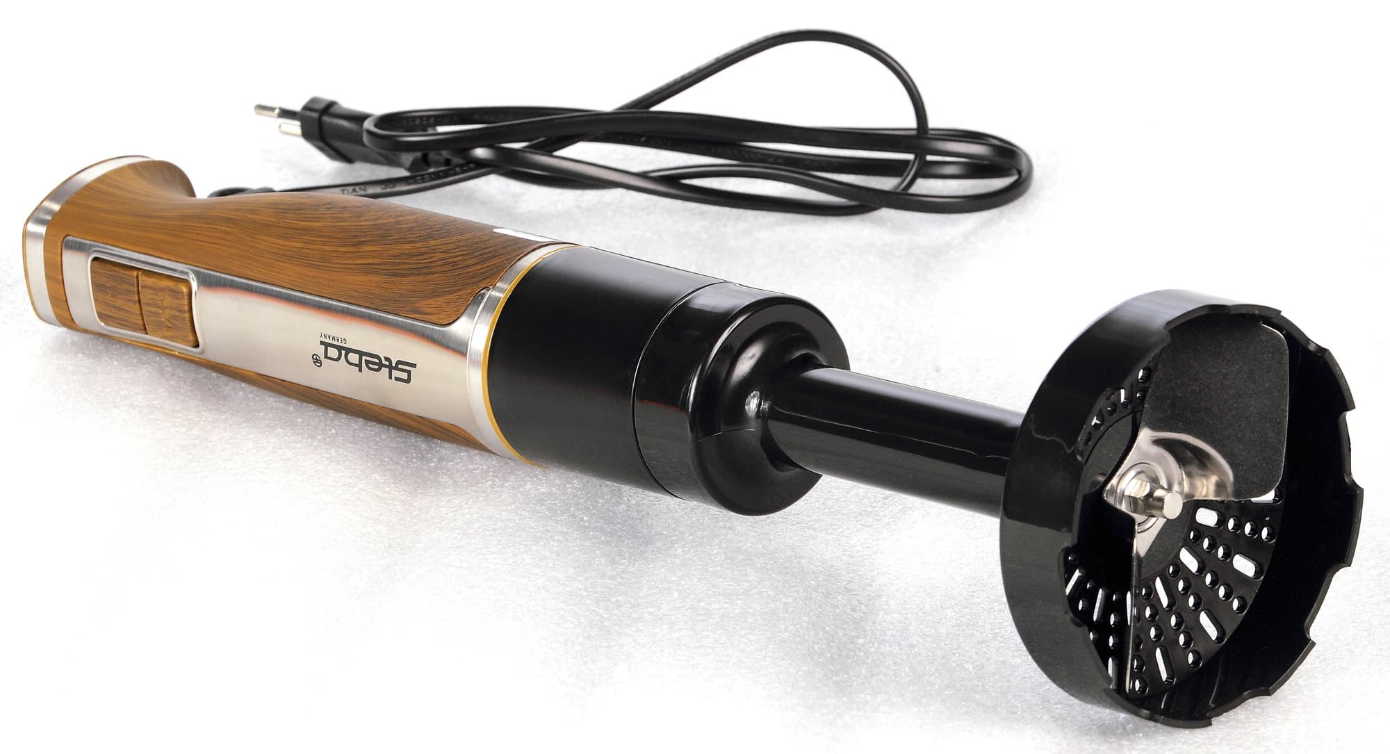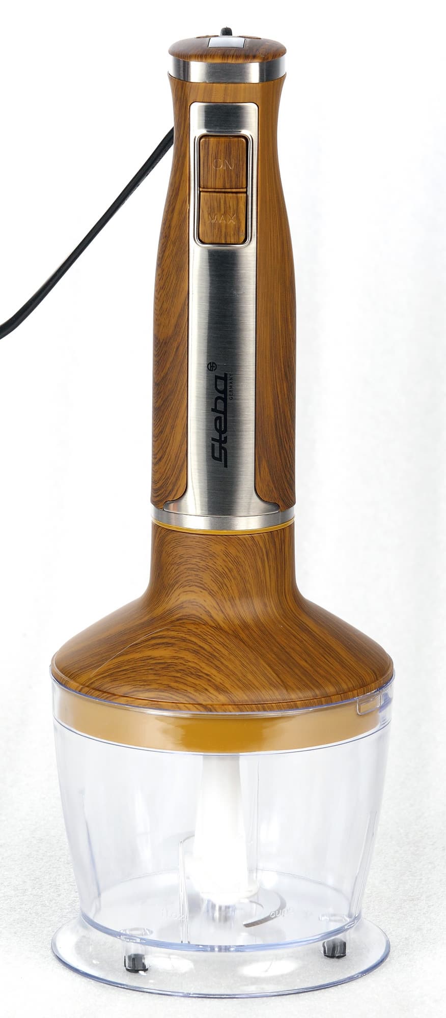Моторный блок, он же ручка с электромотором, выполнен из металла и пластика. Пластик окрашен «под дерево». Внешний вид блендера, впрочем, как и всех изделий от Steba, довольно благороден в своей простоте и невычурности. Не сказать, что ручка очень легкая, но благодаря своей эргономичной форме она удобно размещается в ладони, пальцы свободно дотягиваются до кнопок управления. На ощупь пластик не скользит, никаких запахов не издает. Сверху на моторном блоке выделен LED-дисплей с двумя, расположенными над ним, кнопками увеличения и уменьшения скорости вращения ножей. Насадки надеваются на моторный блок просто: необходимо вставить насадку и повернуть ее по часовой стрелке до упора.