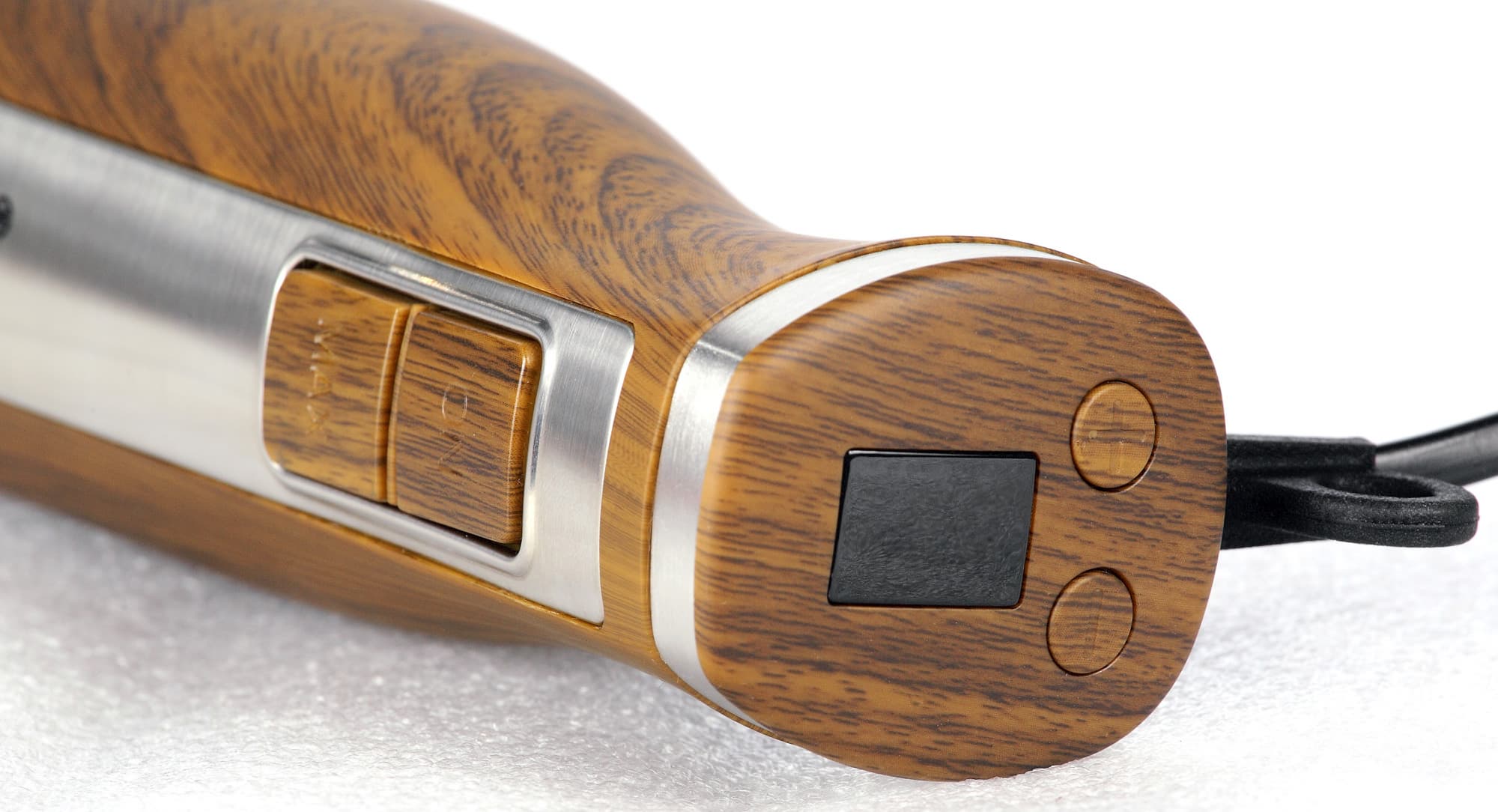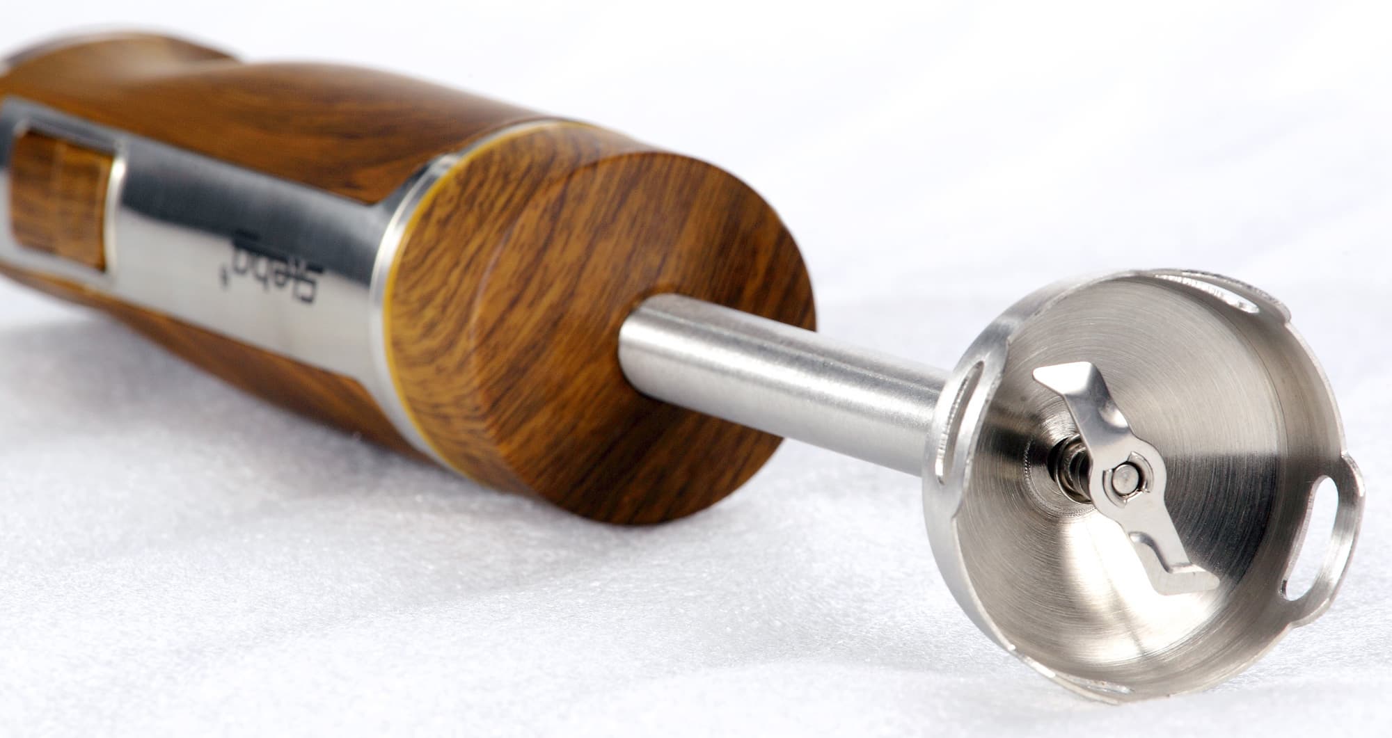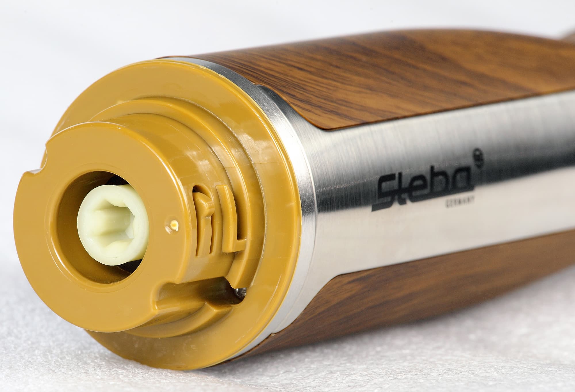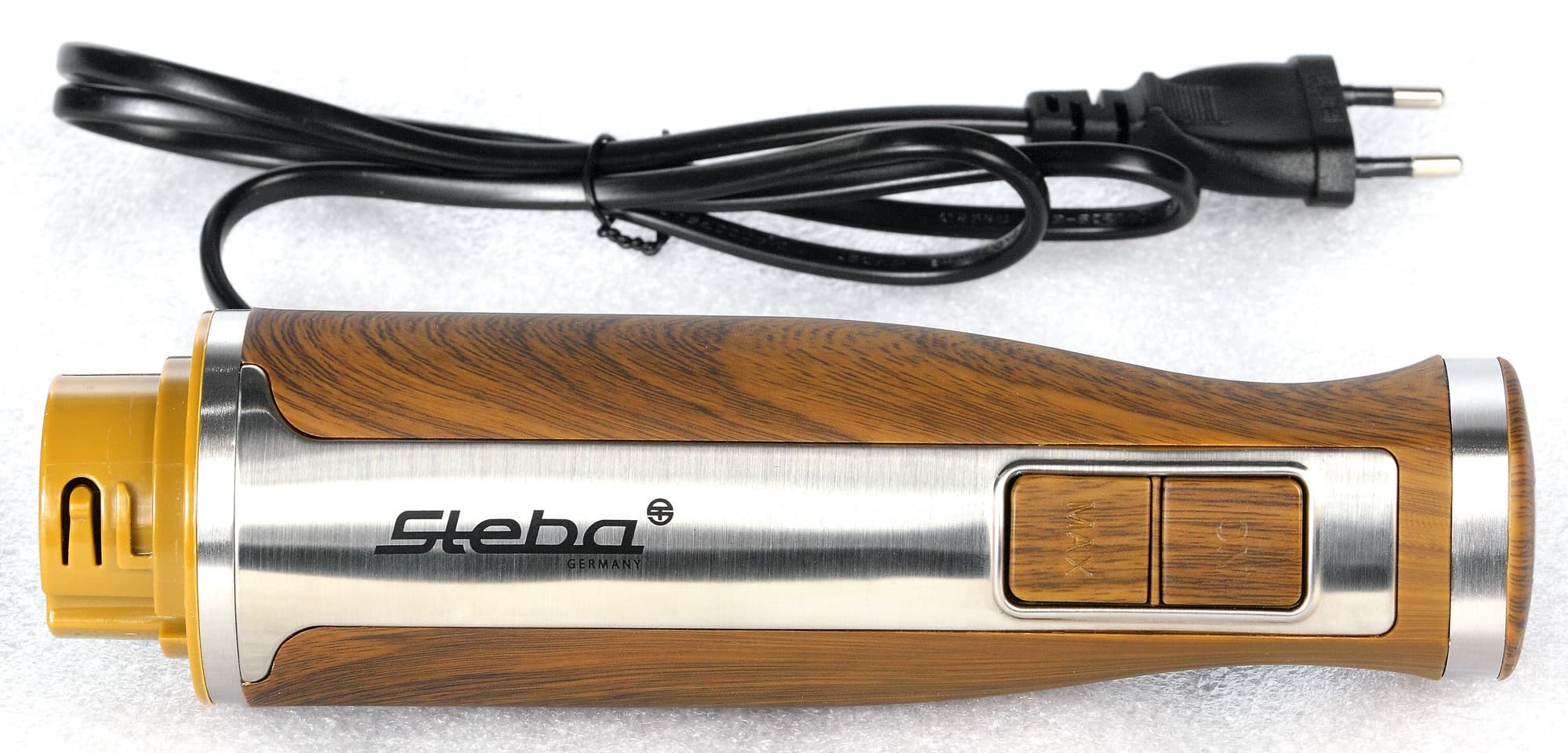 Моторный блок, он же ручка с электромотором, выполнен из металла и пластика. Пластик окрашен «под дерево». Внешний вид блендера, впрочем, как и всех изделий от Steba, довольно благороден в своей простоте и невычурности. Не сказать, что ручка очень легкая, но благодаря своей эргономичной форме она удобно размещается в ладони, пальцы свободно дотягиваются до кнопок управления. На ощупь пластик не скользит, никаких запахов не издает. Сверху на моторном блоке выделен LED-дисплей с двумя, расположенными над ним, кнопками увеличения и уменьшения скорости вращения ножей. Насадки надеваются на моторный блок просто: необходимо вставить насадку и повернуть ее по часовой стрелке до упора.