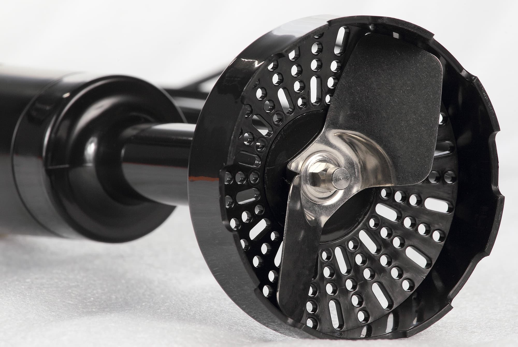 Насадка-блендер и насадка-венчик выполнены из нержавеющей стали и пластика. Насадка-блендер внешне производит неплохое впечатление: металл отлично обработан, глубокая полусфера для измельчения, четыре крупных отверстия для свободного движения перемолотых масс, довольно острые лопасти ножей. Однако двухлепестковый нож небольшой, диаметром чуть больше 4 см. Диаметр самой полусферы, в которой происходит измельчение — 6 см.