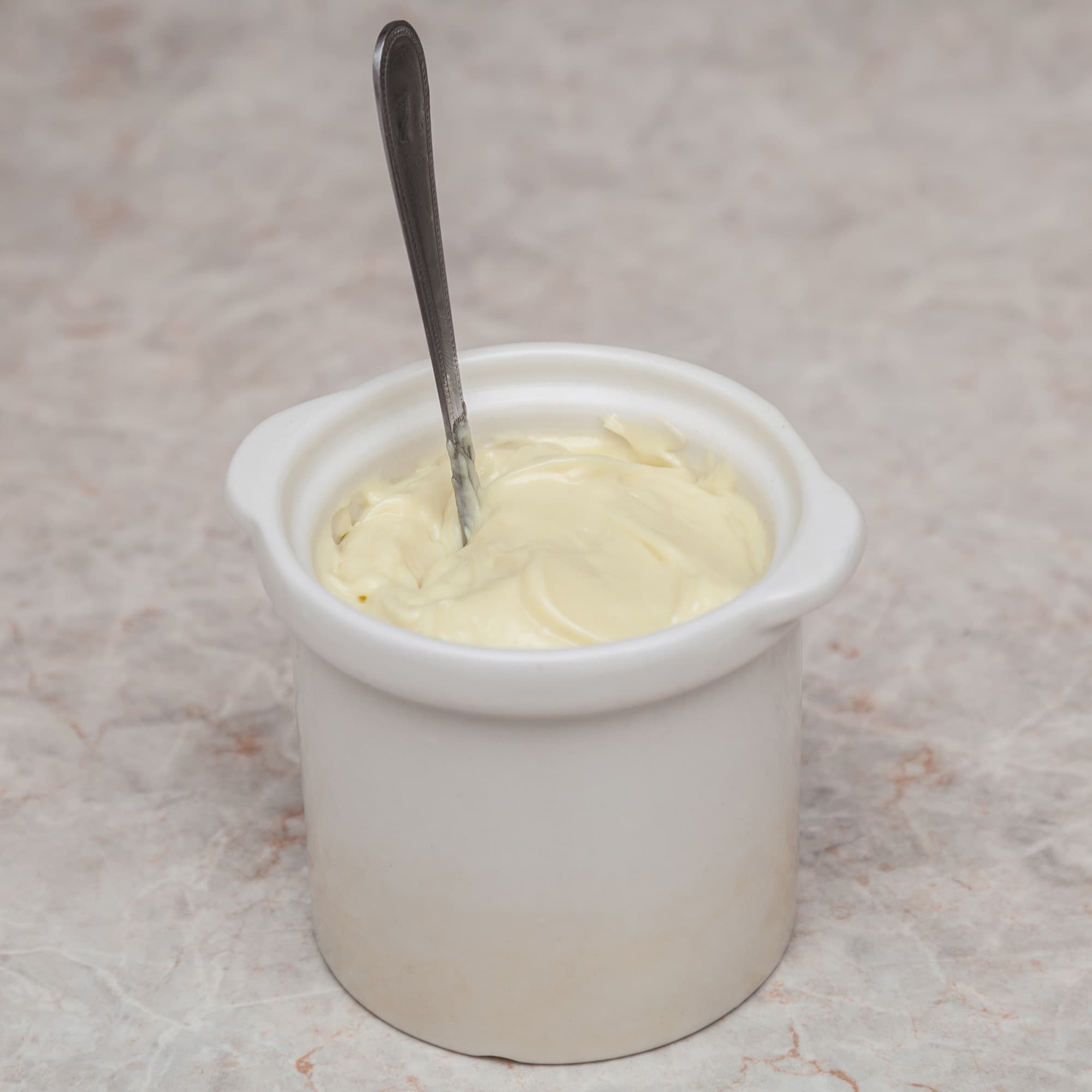 В два желтка, перемешанных с солью, по чайной ложке добавлялось оливковое масло. Уже при перемешивании желтков с солью стало ясно, что, несмотря на малый размер полусферы блендера, объем двух желтков слишком мал для эффективного смешивания, поэтому был добавлен еще один желток. Итак, три желтка и малое количество масла быстро превратились в довольно густую эмульсию. Точнее, очень даже густую. Продолжили вливать масло и понемногу добавлять уксус. В общей сложности для изготовления соуса нам потребовалось около 200 мл или чуть больше оливкового масла, столовая ложка горчицы и пара-тройка столовых ложек уксуса. Перемешивали на самой низкой скорости.