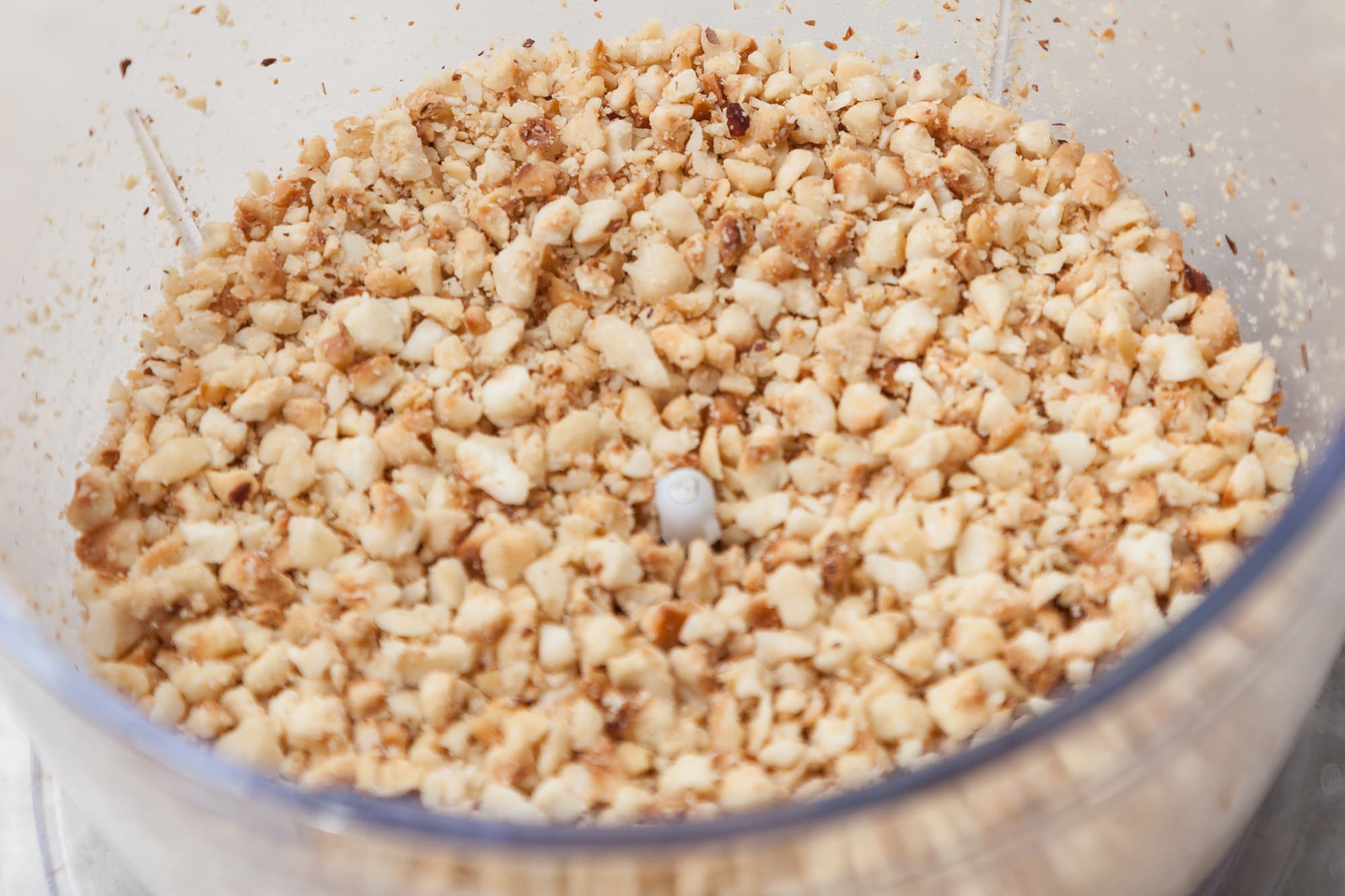 150 граммов жареного фундука измельчали 30 секунд на 6-й скорости. Орехи перемололись неоднородно, встречались как крупные кусочки, так и мелкая ореховая крошка. При дальнейшем измельчении диаметр крошек не изменился.