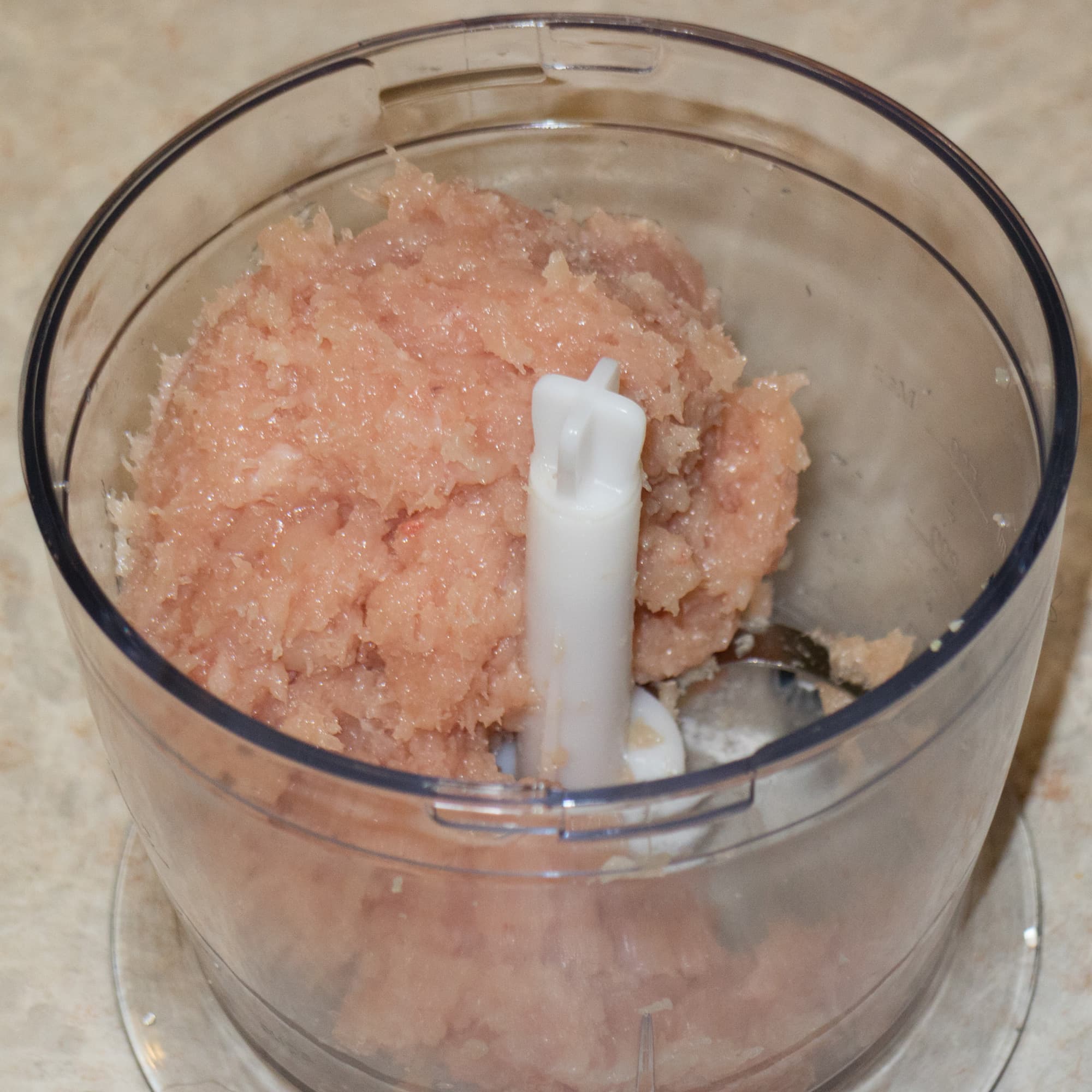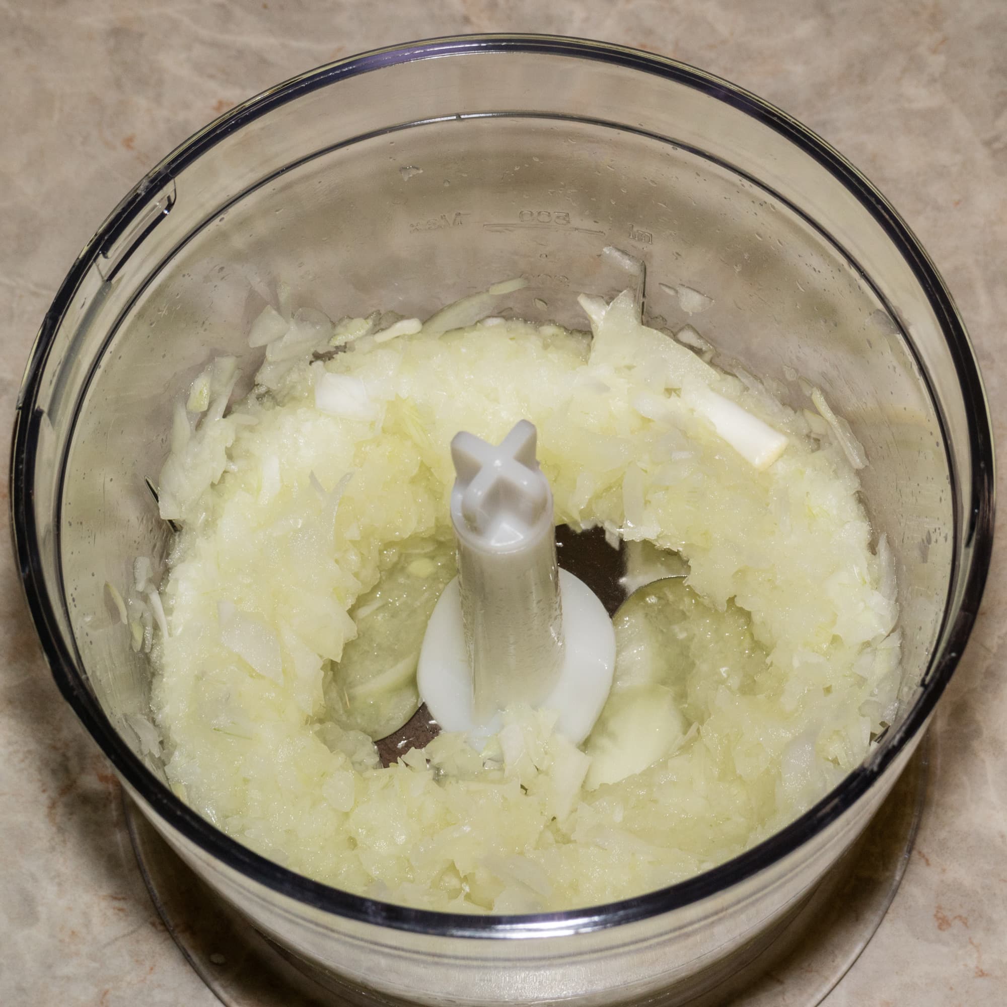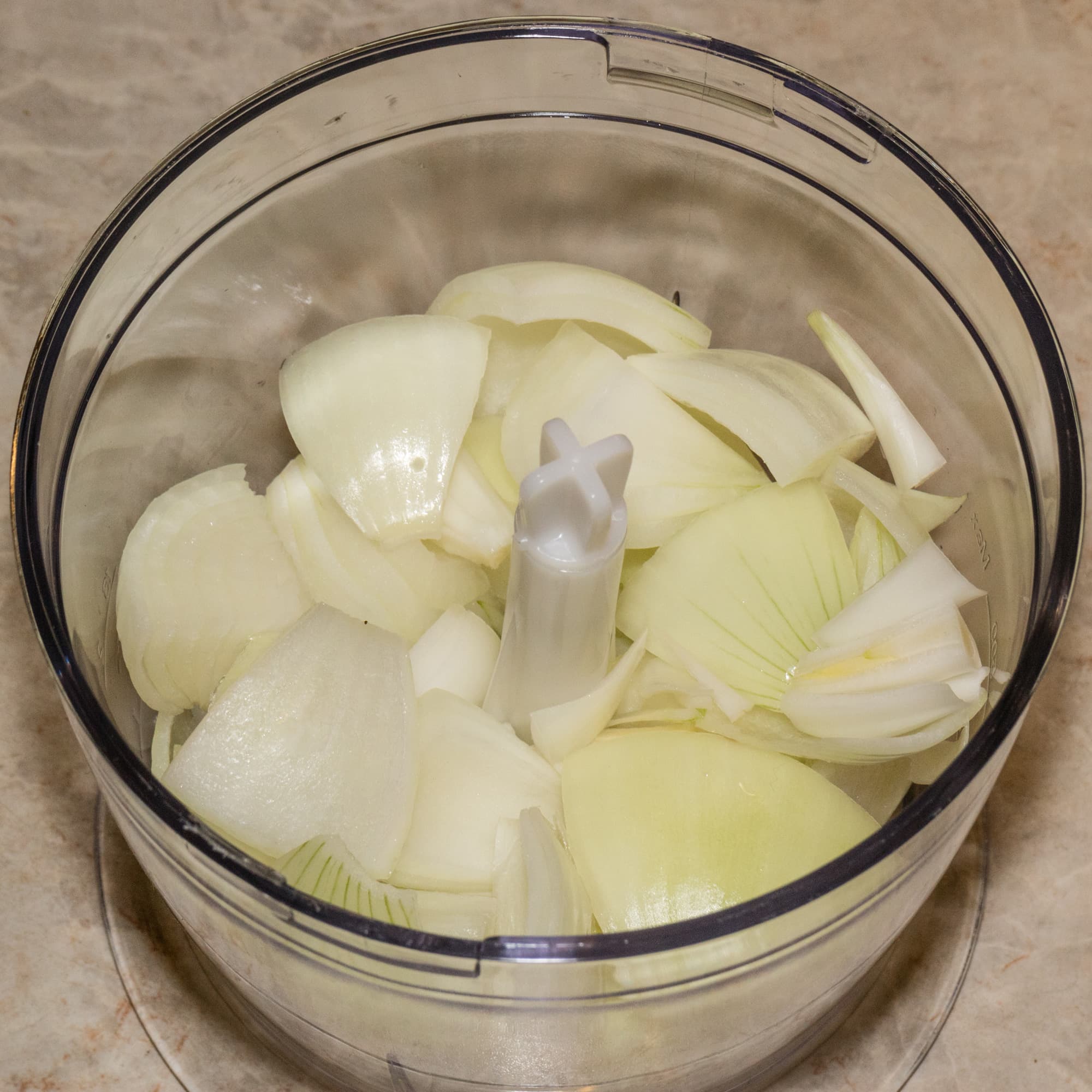Одну очищенную и нарезанную луковицу весом в 230 граммов измельчали на 8-й скорости в течение 10 секунд.