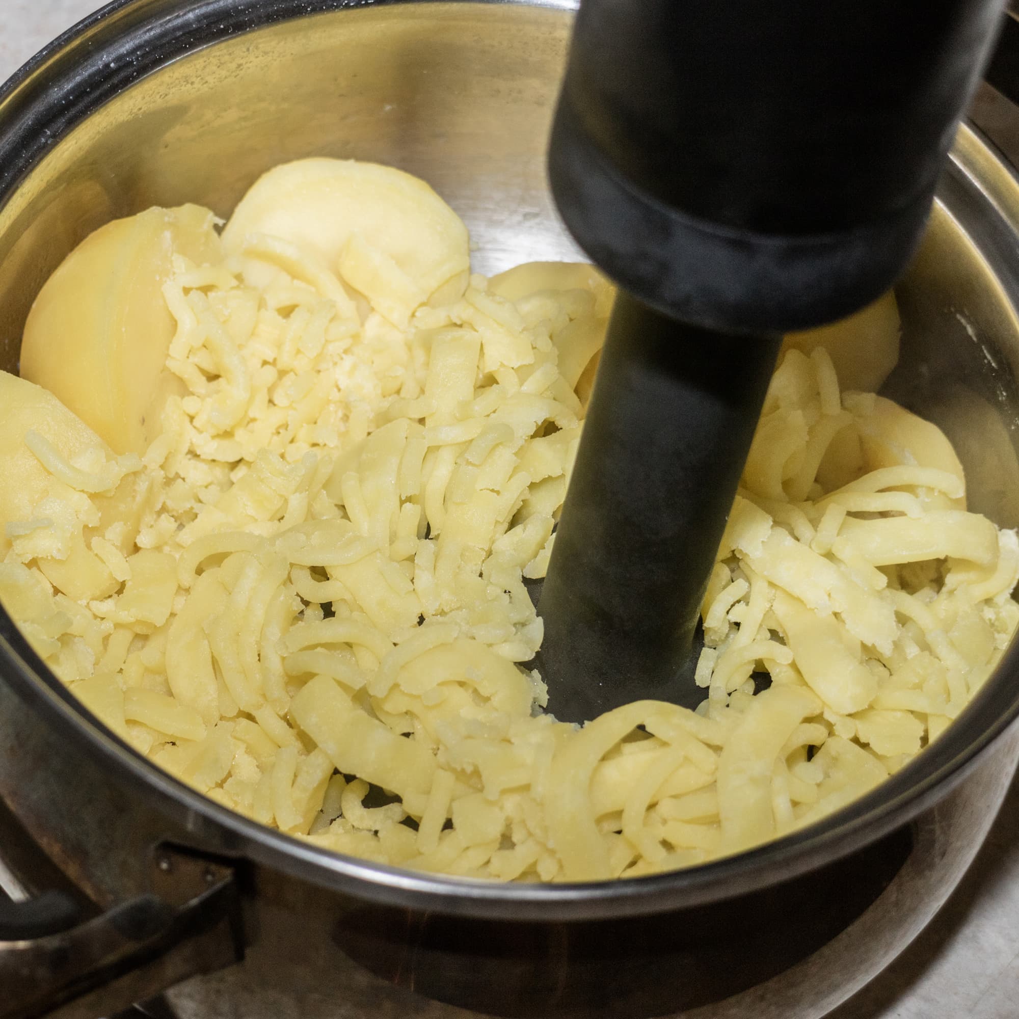 Картофель был отварен с добавлением небольшого количества соли, перца горошком и лаврового листа. После этого отвар был слит. Пюрировали небольшое количество картофеля около 3 минут на 2-й скорости. Нам показалось, что с добавлением сливок продукт пюрируется быстрее, хотя производитель советует измельчать продукты без добавления жидкости.