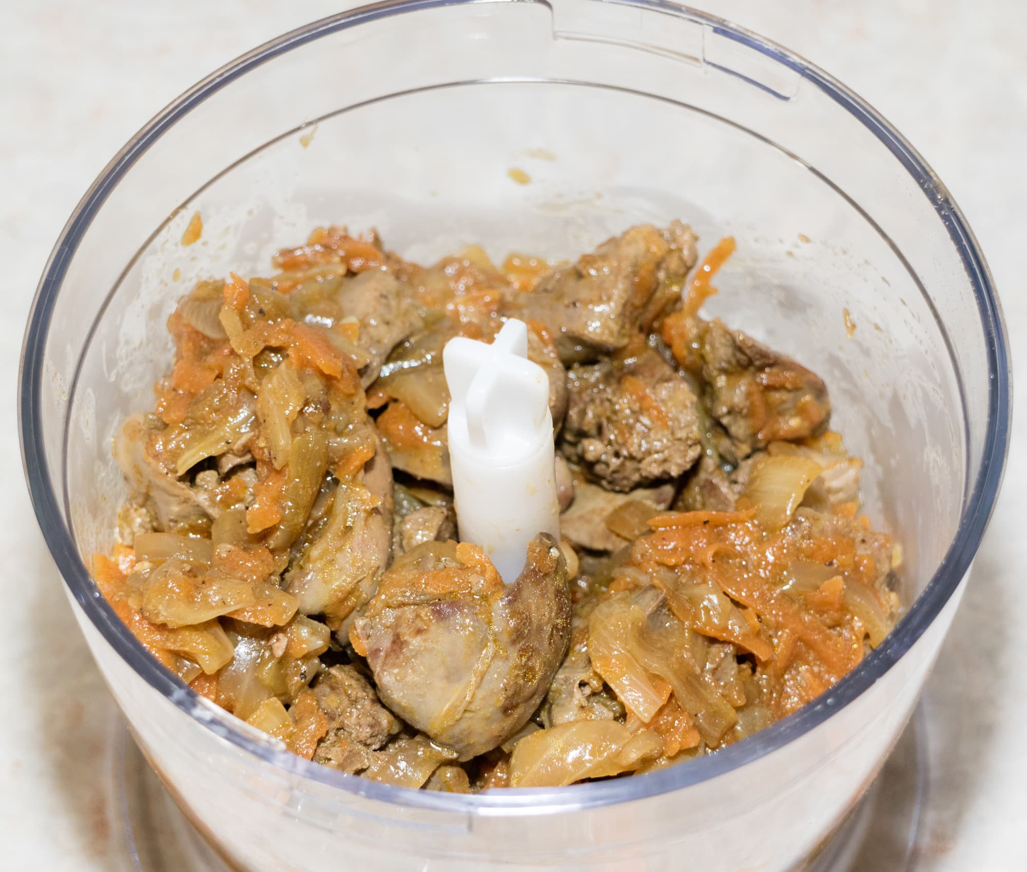 Затем поместили тушеную печень с овощами в чашу для измельчения, заполнив ее до отметки 500 мл. Время измельчения не замеряли, обрабатывали до достижения желаемой консистенции. Добиться полностью гомогенизированной структуры паштета нам не удалось. Консистенция стандартная для погружных блендеров: немного зернистая.
