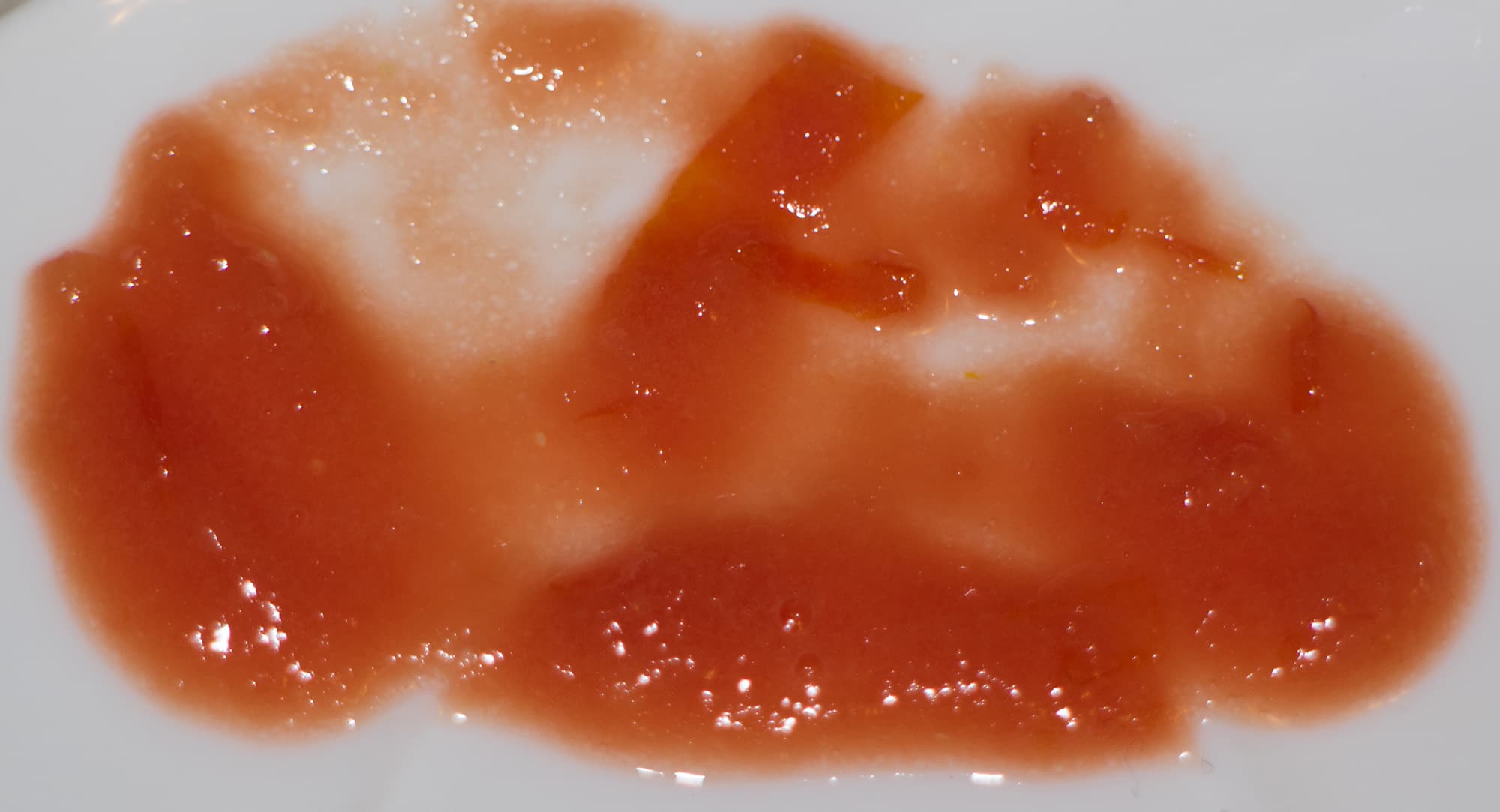 Для проведения этого обязательного теста мы взяли томаты общим весом 400 граммов. Блендировали насадкой для измельчения в течение полутора минут. Результат стандартный для погружных блендеров: иногда встречаются остатки зёрен и мелких неперемолотых кусков шкурки, но в целом масса гомогенная.