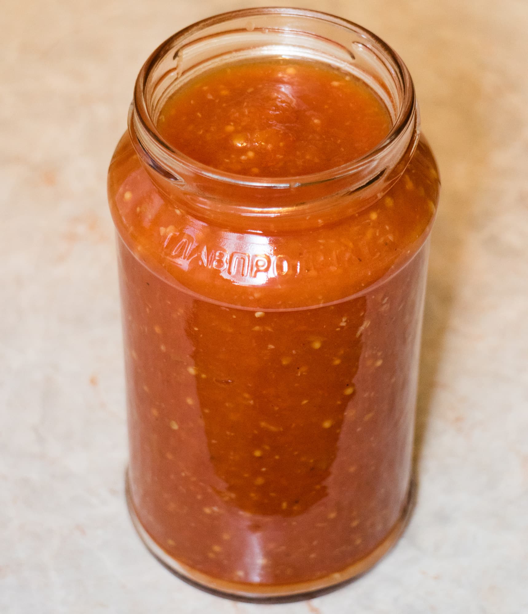 В томатное пюре был добавлен чеснок, чайная ложка семян горчицы, соль, сахар и молотый перец. Варили около 20 минут, чтобы выпарить лишнюю влагу. В результате получили вкусный томатный соус, подходящий ко многим блюдам.