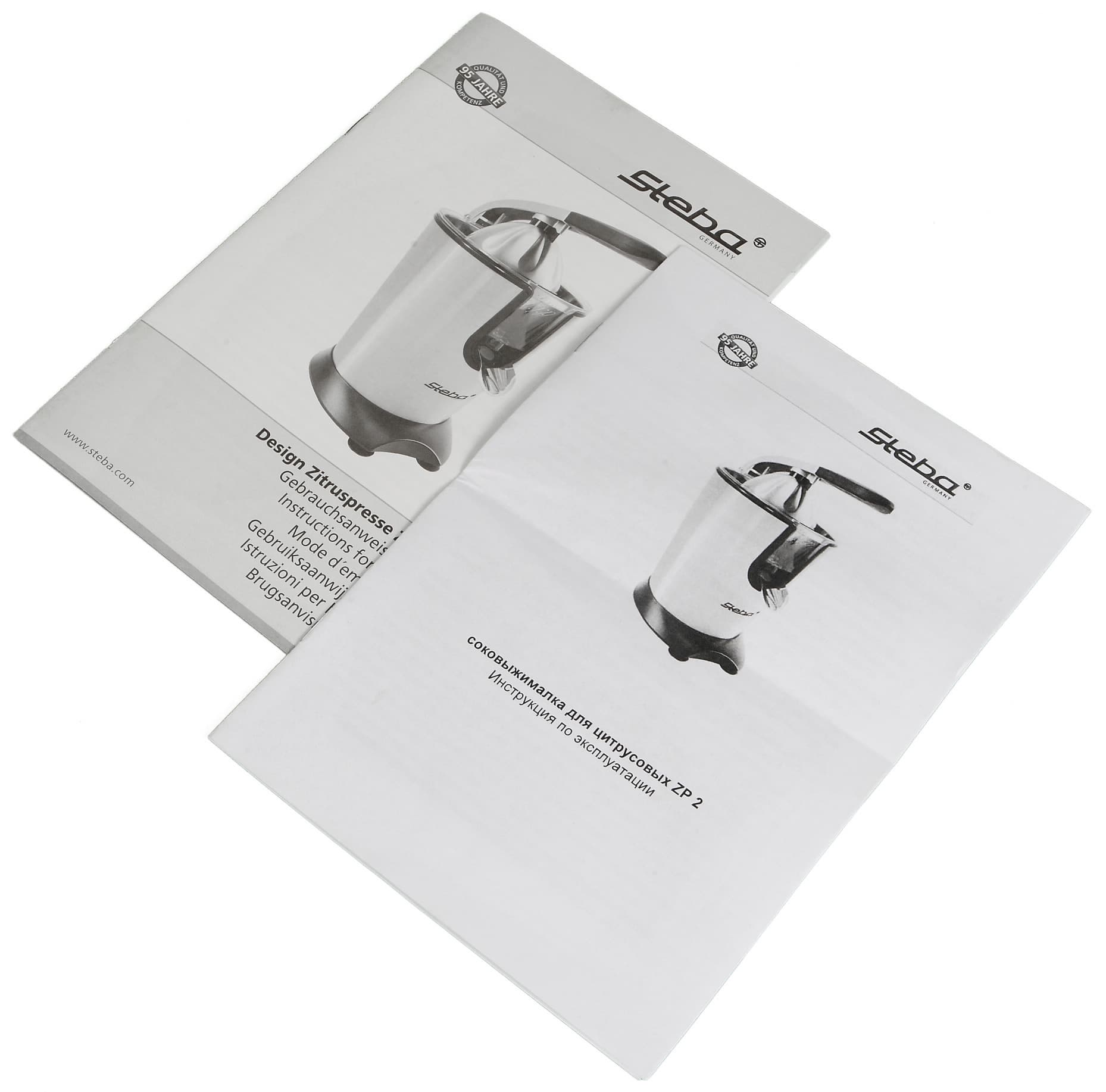 Международная инструкция отпечатана на глянцевой бумаге и содержит разделы на 6 европейских языках. Русское руководство формата А5 напечатано в черно-белом цвете на матовой бумаге. Полезность обоих (в международном мы оценили англоязычный раздел) с точки зрения человека, понимающего, по какому принципу работает соковыжималка для цитрусовых, примерно равна нулю.