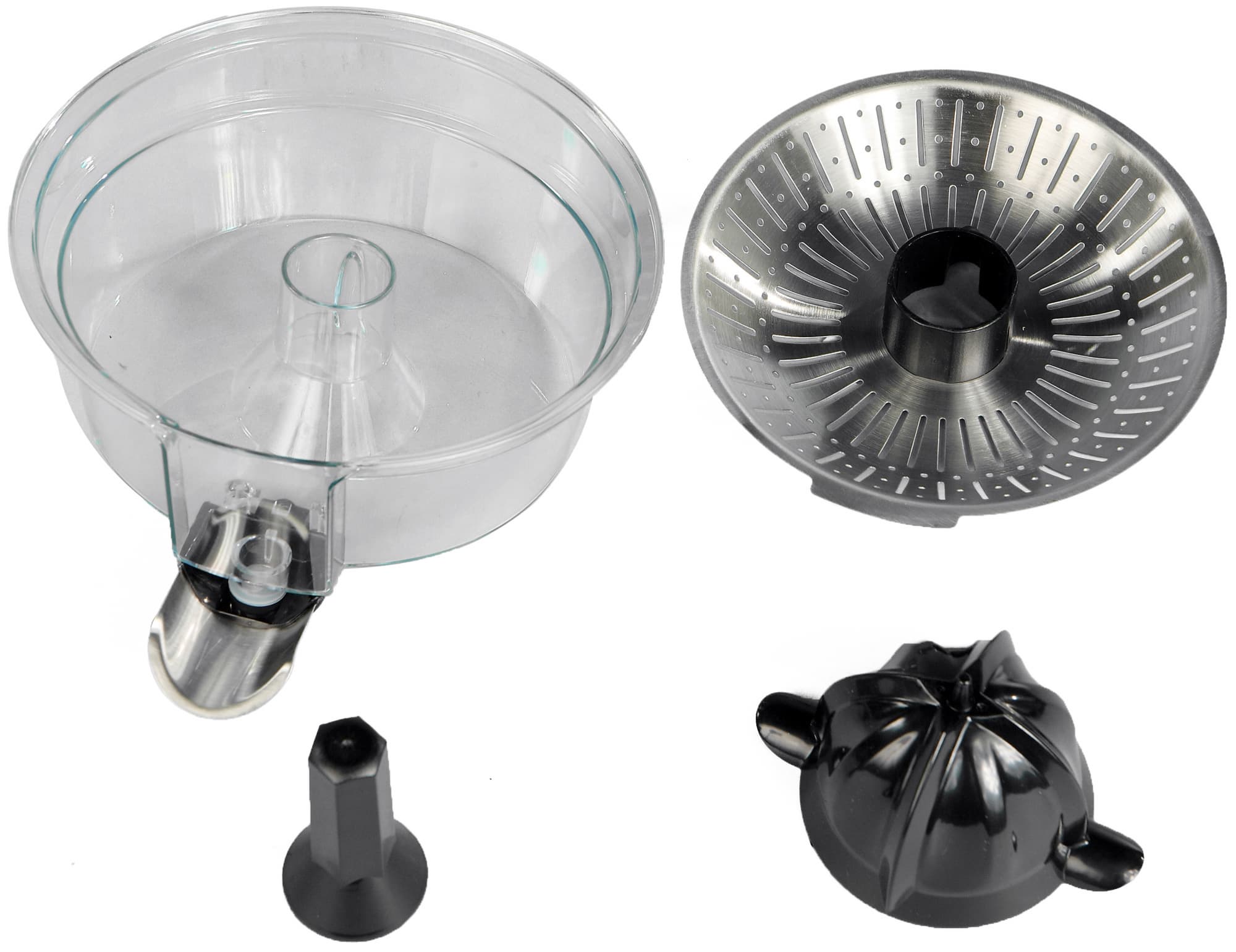 Разборка очень простая: сперва снимаем, потянув вверх, соковыжимающий конус, потом — фильтр, потом — емкость для сока, потом — специальную втулку.