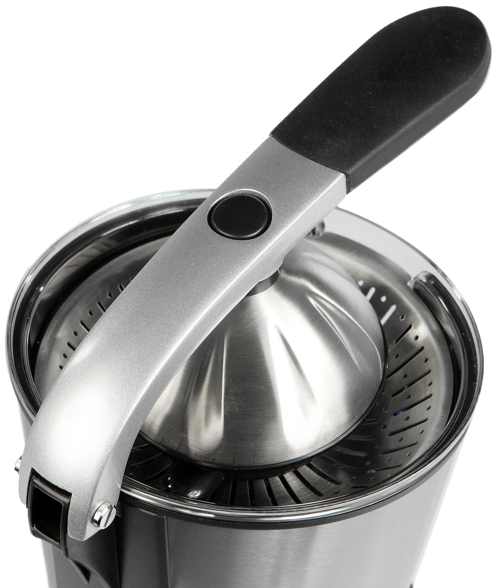 Как мы уже писали выше, все сводится к тому, чтобы засунуть половинку цитруса в специальную чашу и потом с помощью рычага надавить ею на конус. Конус начнет вращаться, выдавливая из цитруса сок. Если прекратить давить — конус приподнимется чуть-чуть вверх (миллиметра на 3-4) и остановится.