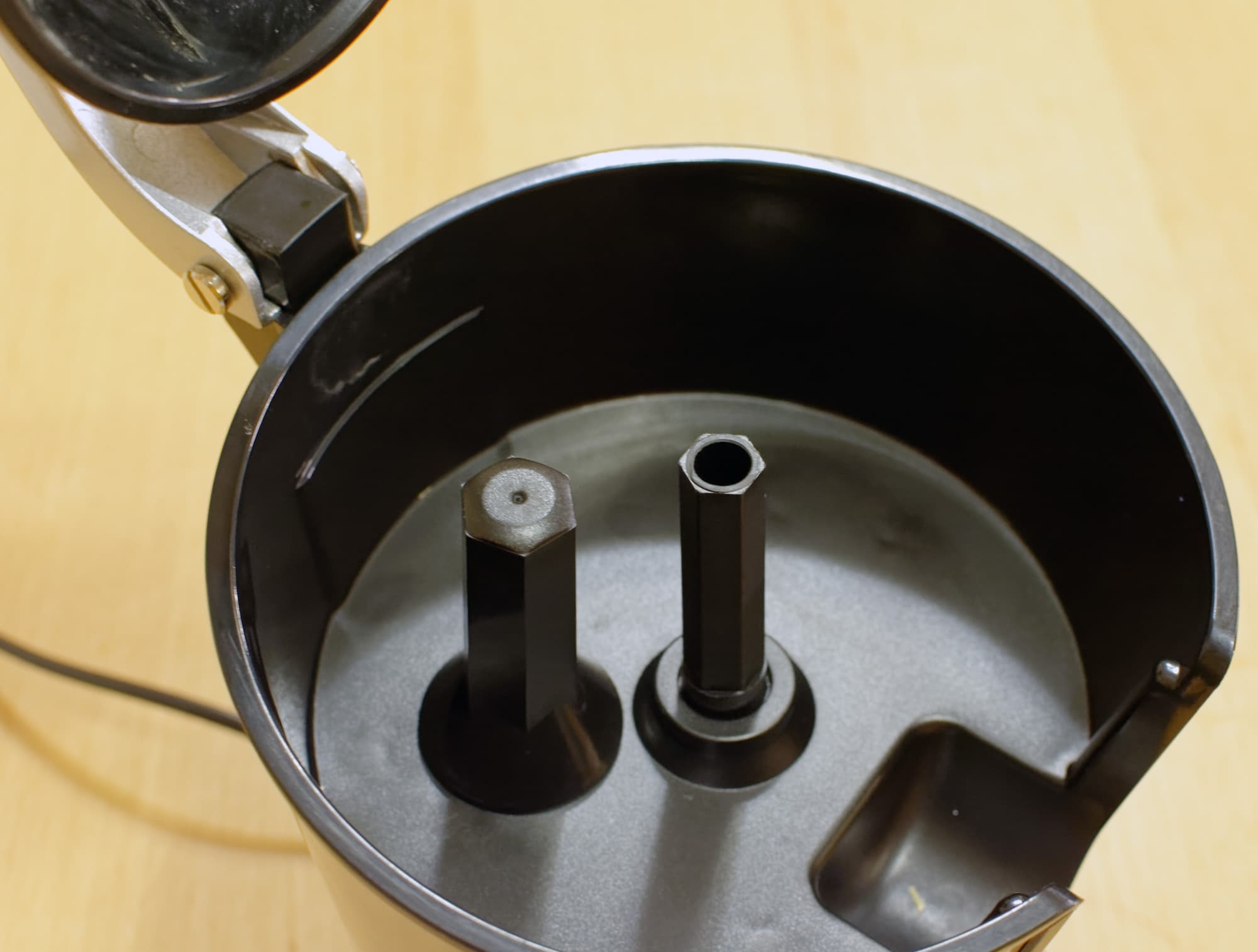 Второй этап разборки — отделение чаши от рычага. Для этого нужно нажать кнопку на рычаге и потянуть чашу вниз.