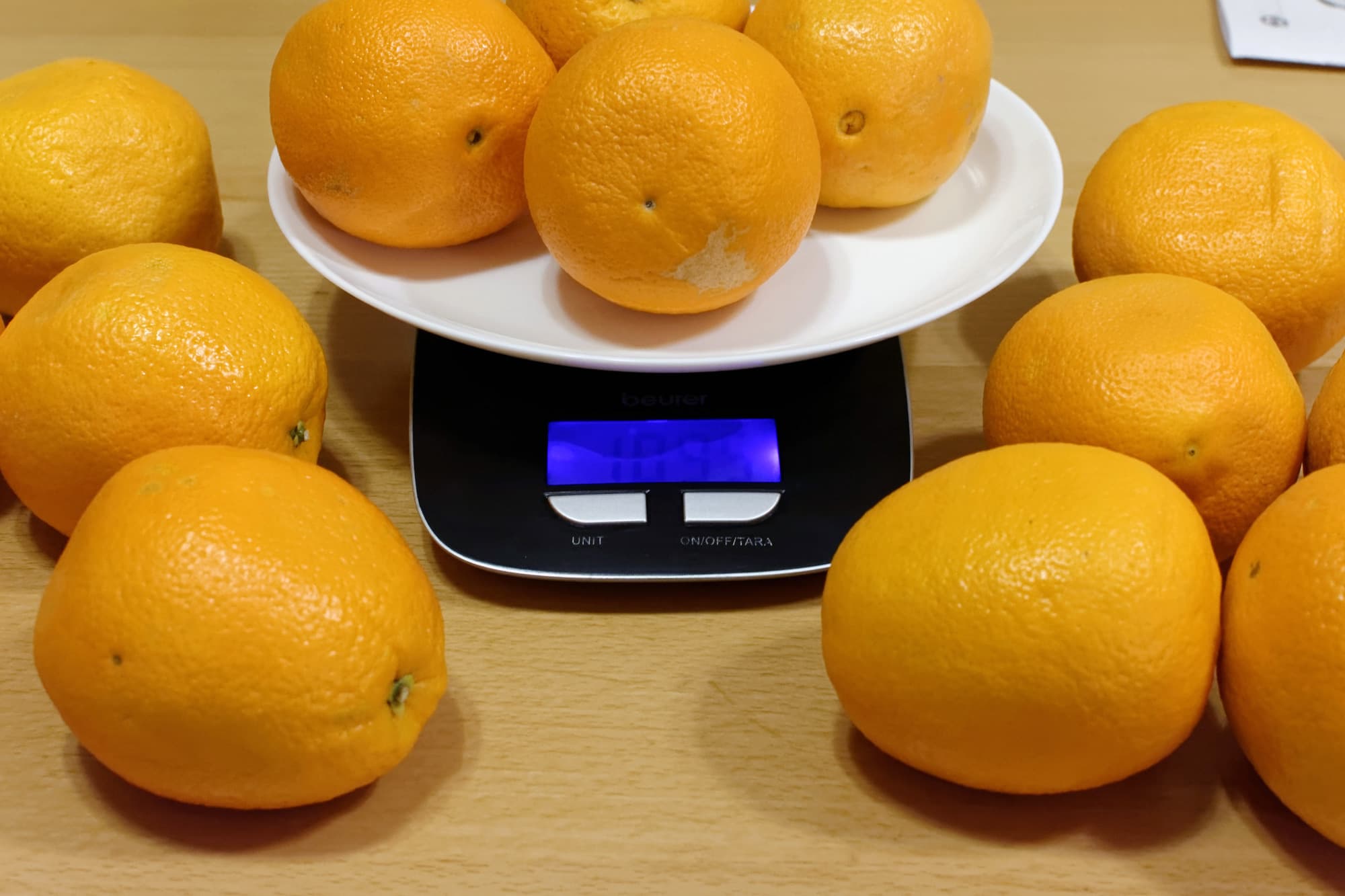 Взяли около килограмма неочищенных апельсинов (1096 граммов — получить точно килограмм не смогли, но это не беда, потом просто отожмем на шнековой столько же).