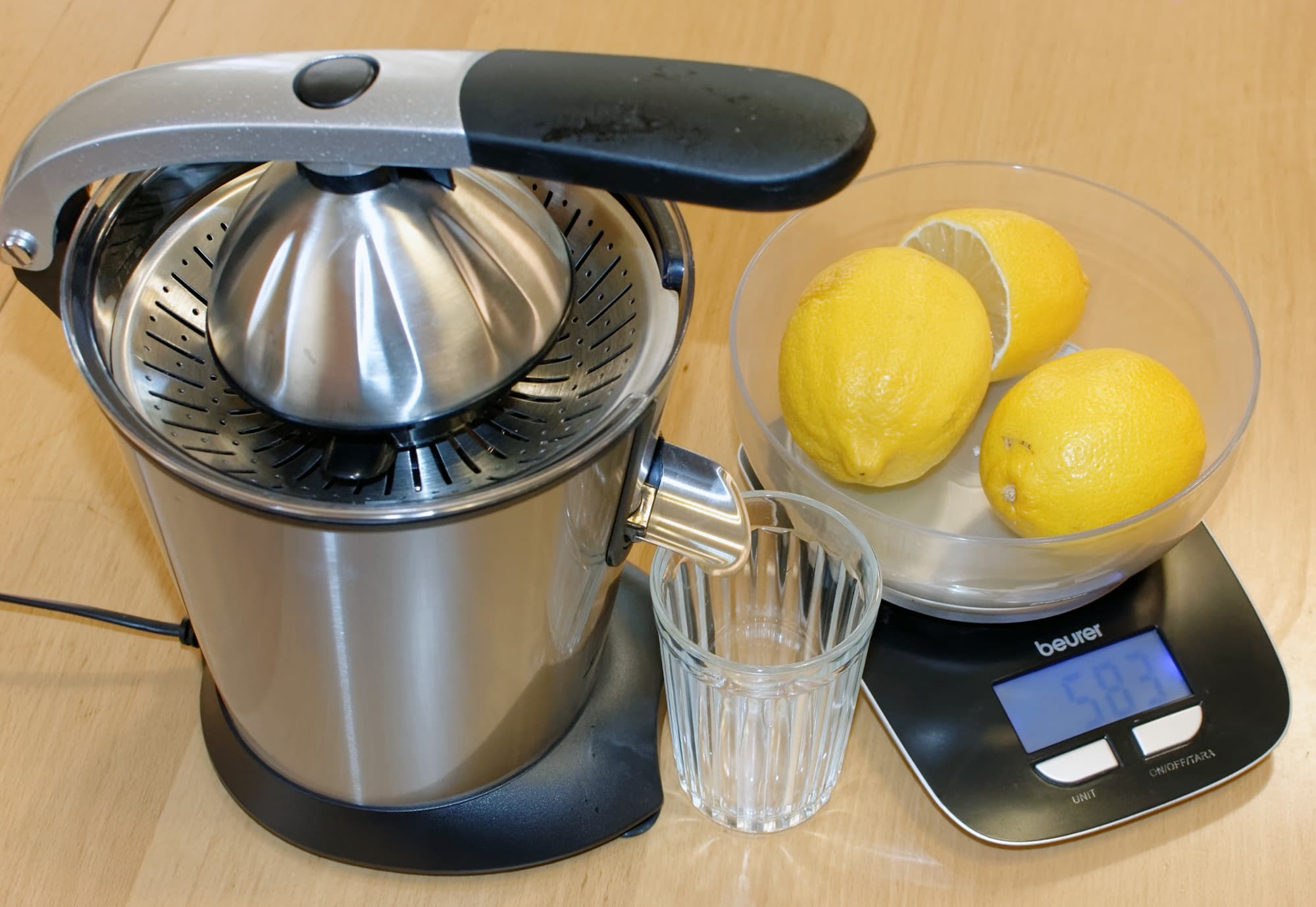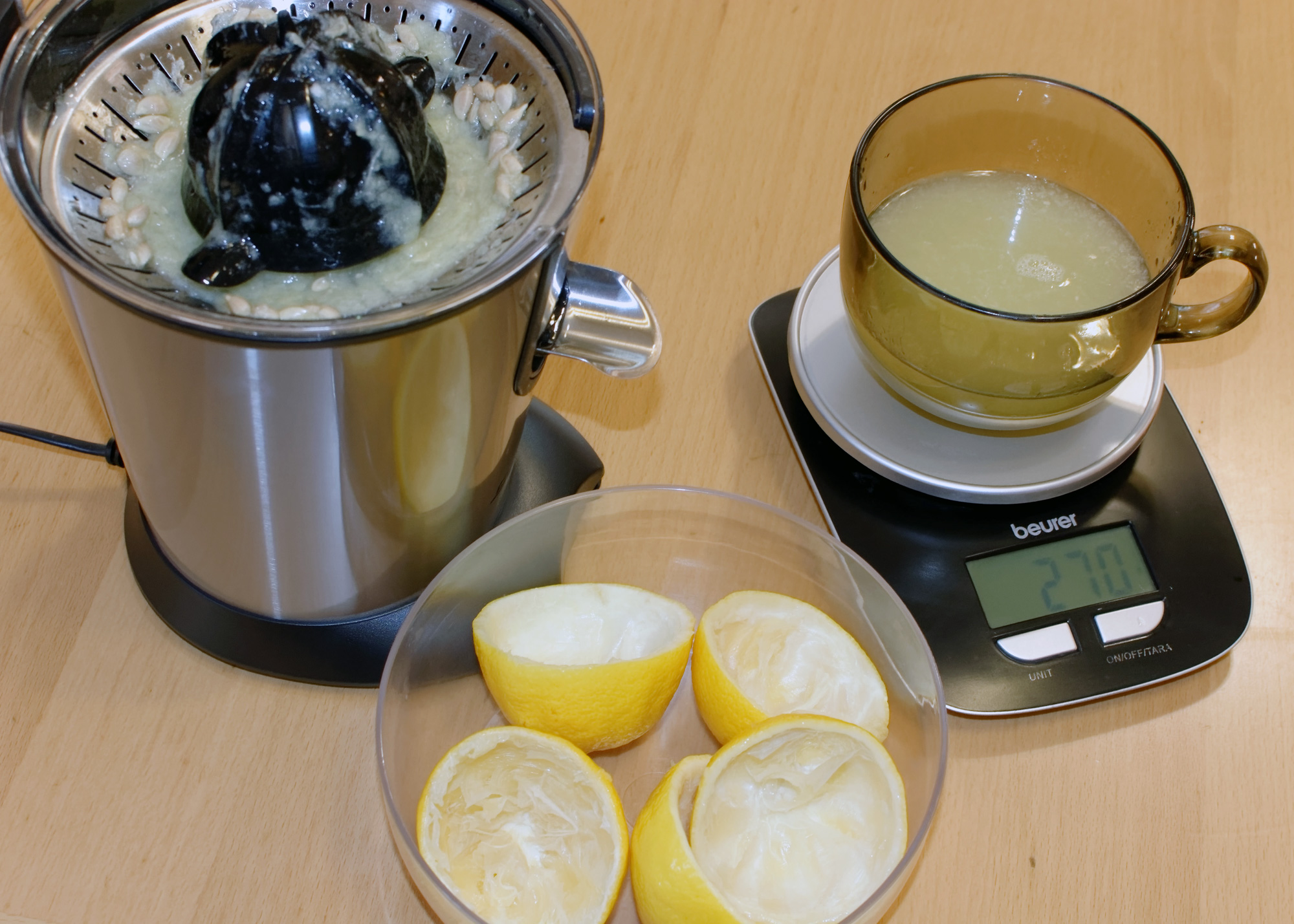 Лимонный сок мало кто пьет — зато его довольно часто используют в процессе приготовления различных блюд. Мы сымитировали как раз такую ситуацию: выдавили два с половиной лимона (583 грамма с кожурой).