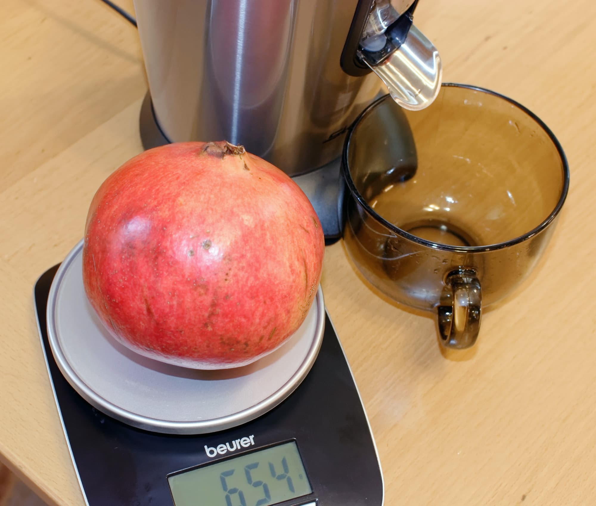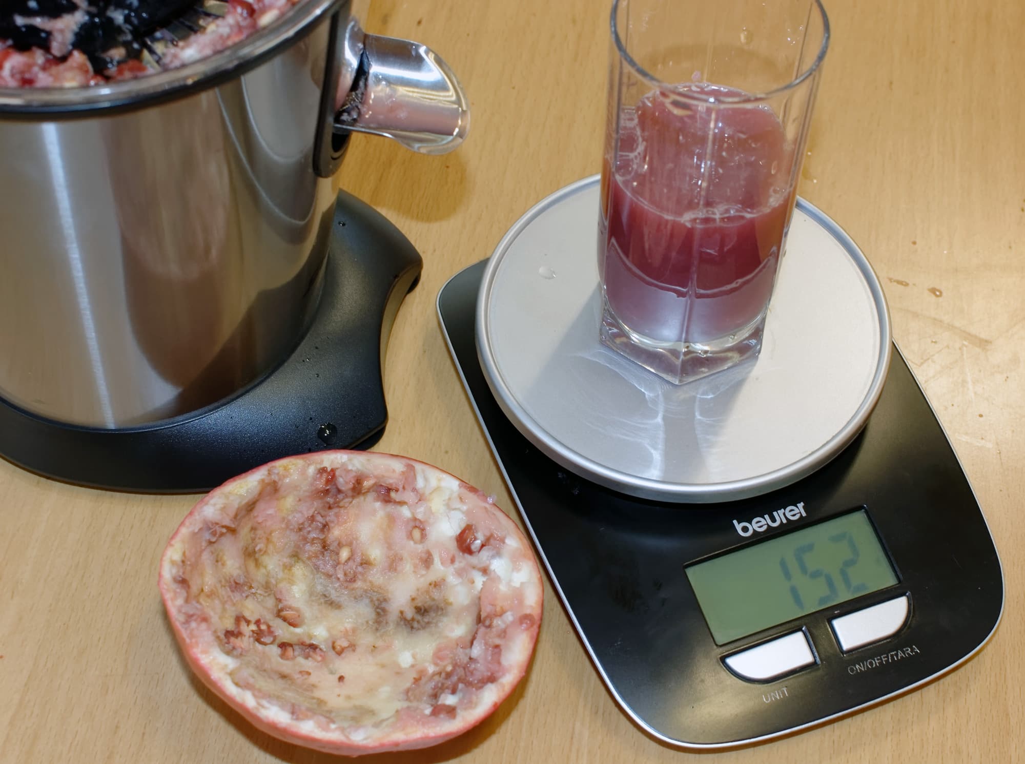 152 грамма сока из 654-граммового граната, эффективность 23%. Не так уж и плохо — у коллег на прессе получилось 25%. Но, к сожалению, это не сок, а смесь сока и жмыха, и пить его не очень приятно.