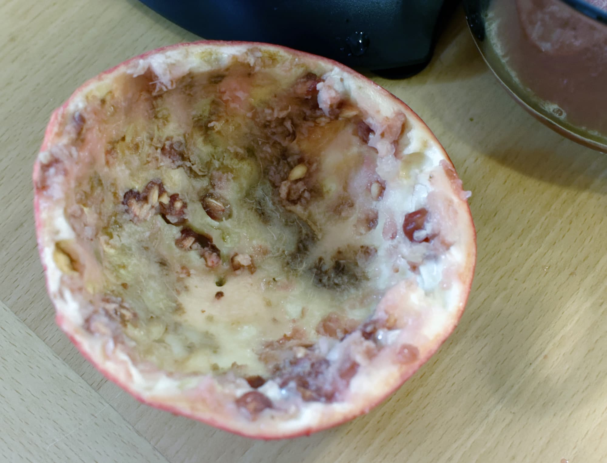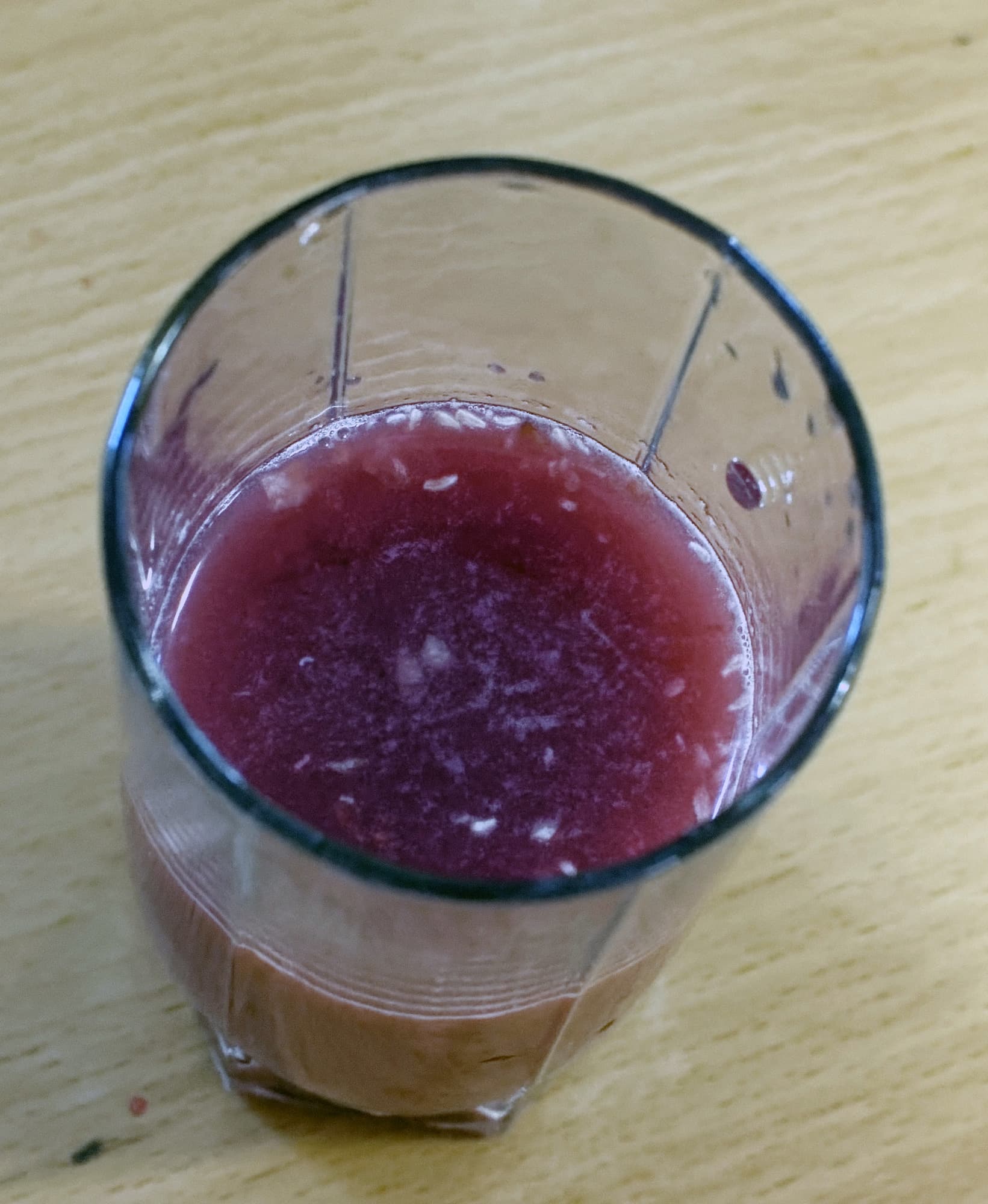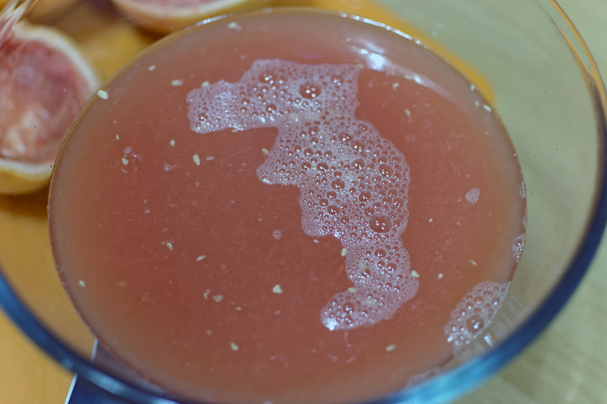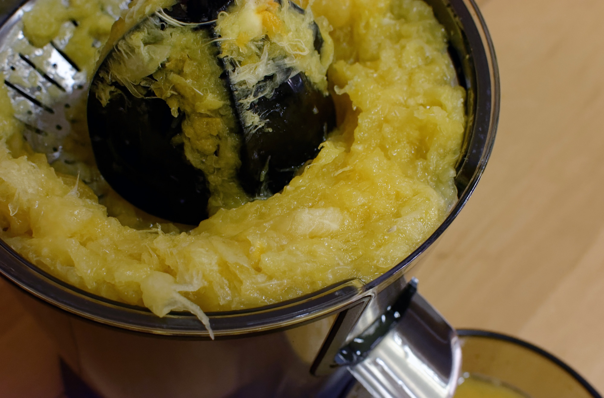 А вот сок — увы — оказался со слишком большим количеством мусора. Это мелкие частички белого жмыха, которым окружены зерна. Он очень хорошо крошится и крошки получаются такого маленького размера, что легко преодолевают фильтр.