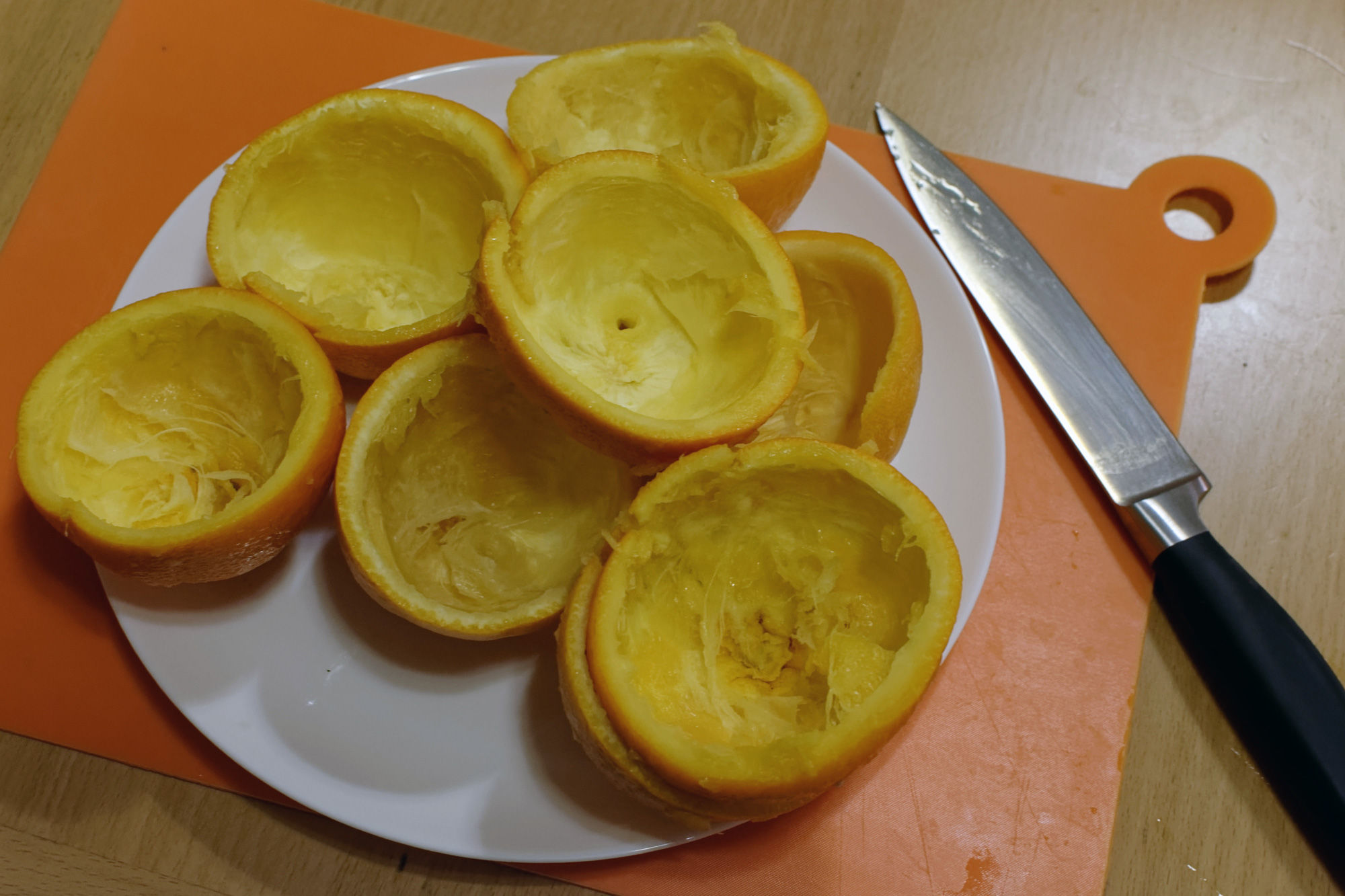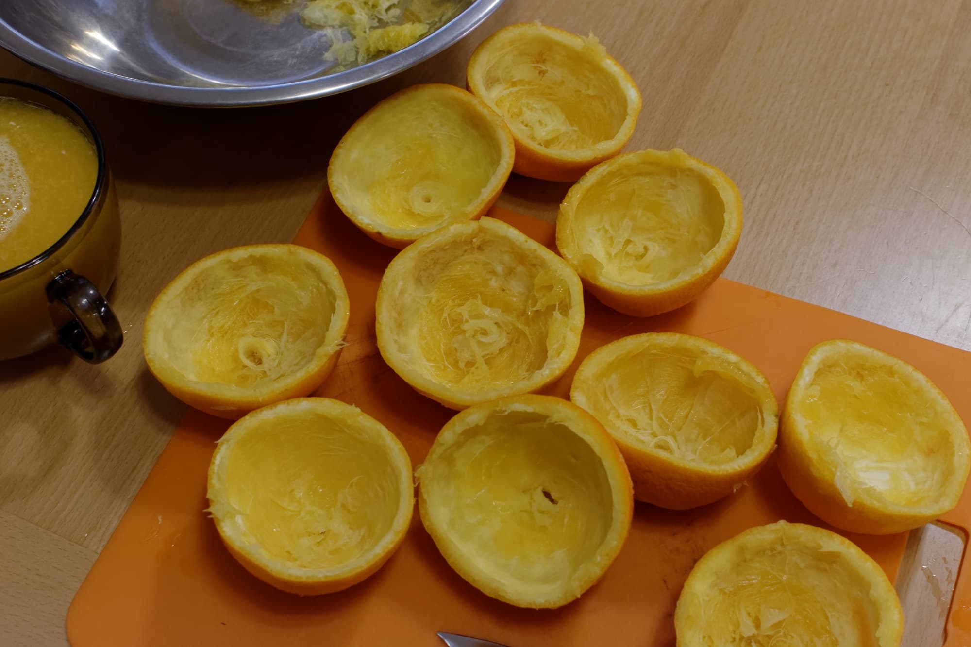 У нас осталось еще 1626 граммов апельсинов с кожурой, и мы решили отжать их все. Правда, теперь мы ни с кем не соревновались, поэтому могли себе позволить не спешить и попытаться добиться за счет этого несколько большей эффективности. После обсуждения было принято 2 «оптимизационных» предложения: