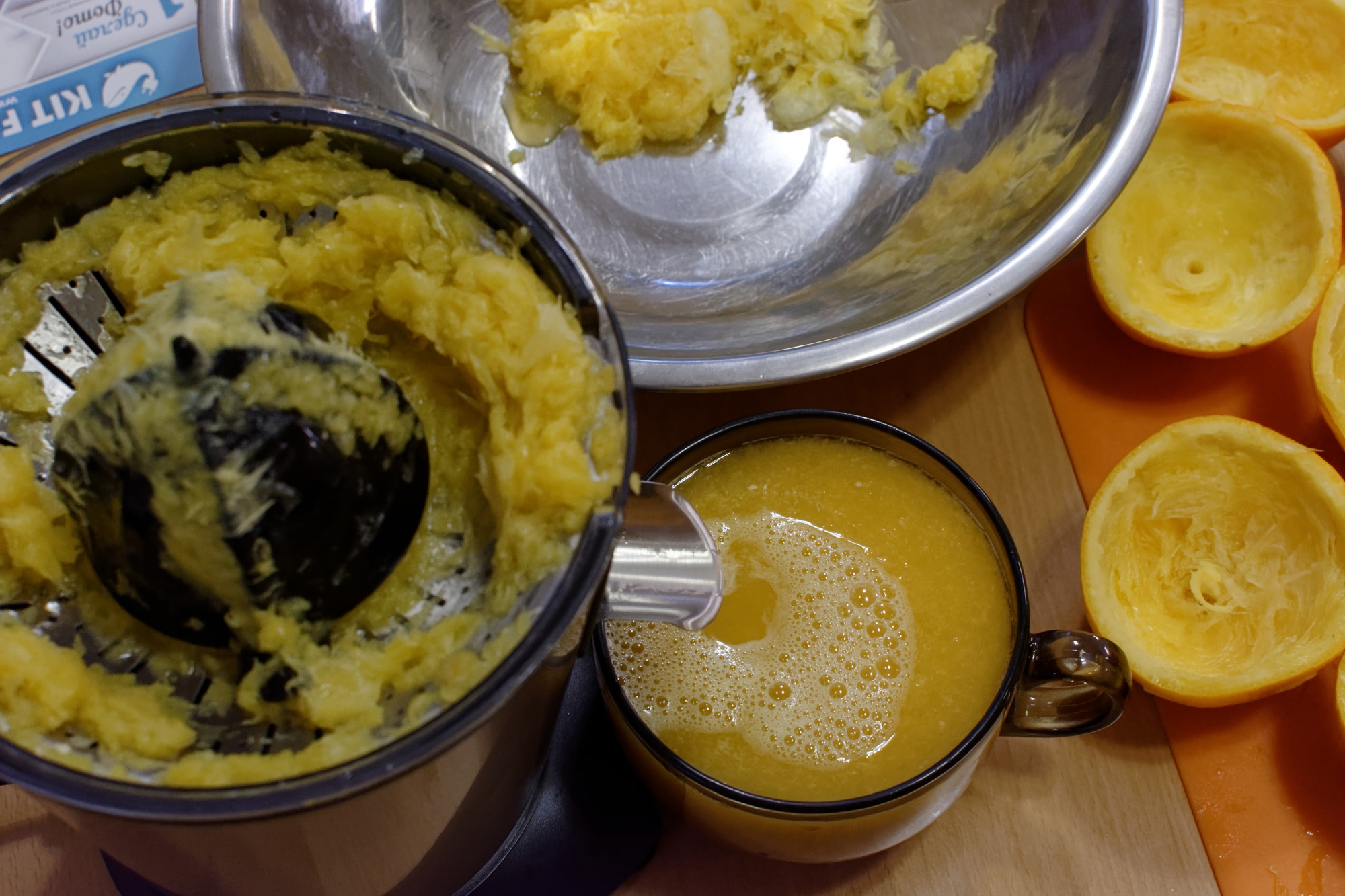 Правда, выход готового продукта нас не очень впечатлил: из 1096 граммов неочищенных апельсинов мы получили всего 363 грамма сока, то есть эффективность около 33%. Посмотрим, что у нас получится на шнековой соковыжималке.