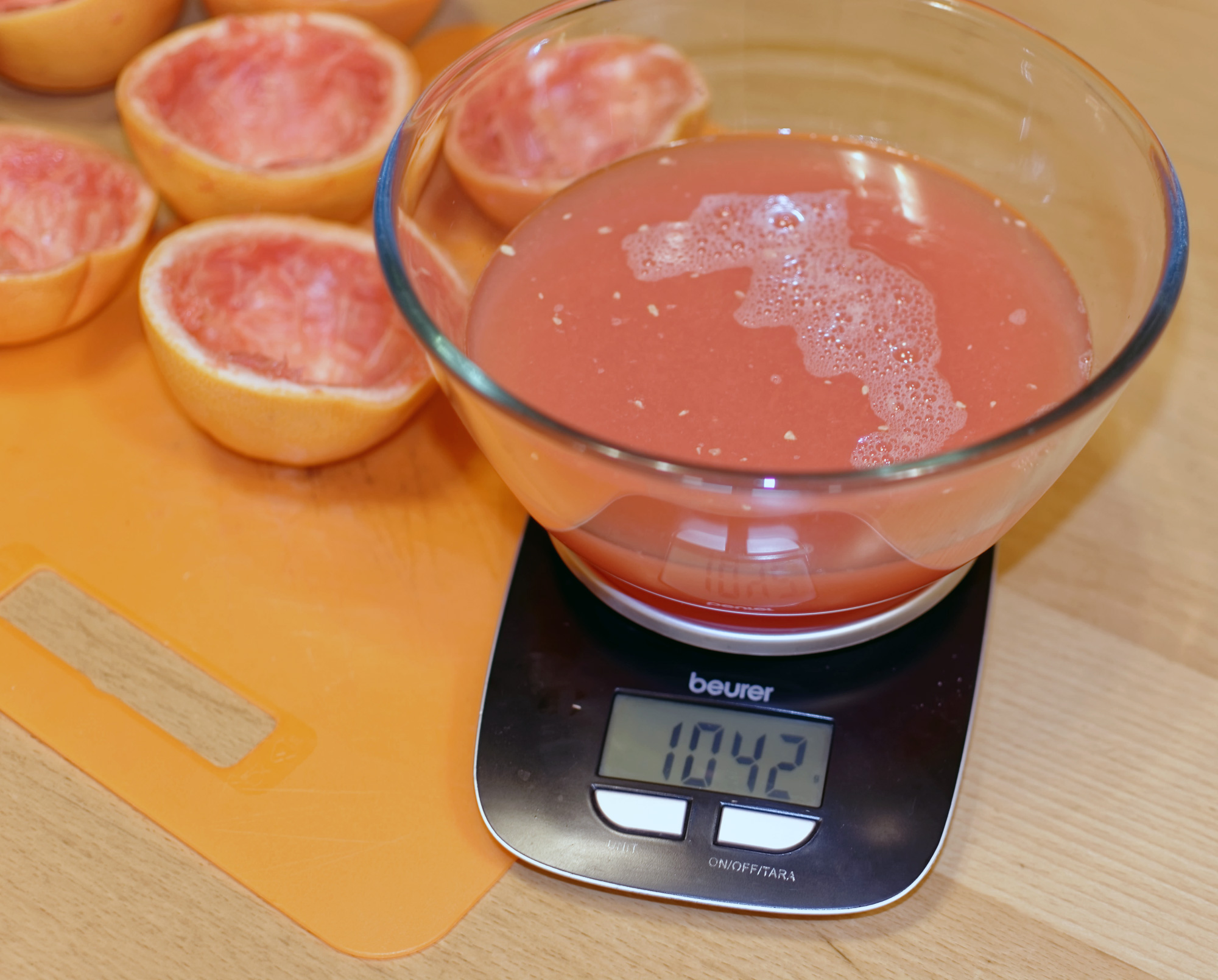 Вес грейпфрутов составил 1998 граммов. По размерам они были больше апельсинов раза, наверное, в полтора. Было очень интересно, как небольшой по сравнению с этими гигантами конус справится с их эффективным отжимом.