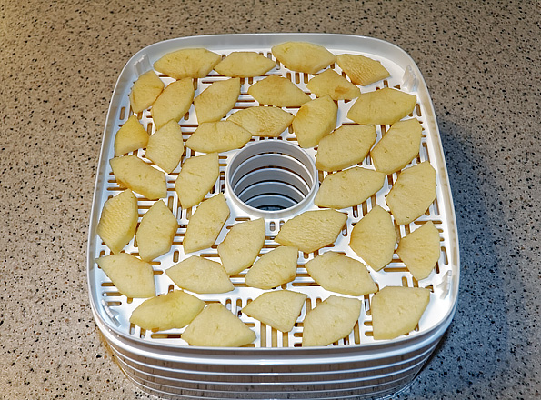 Для этого теста мы взяли яблоки сорта Гренни Смит, очистили их от кожуры, семечек и внутренних перегородок и нарезали на дольки. Изначально мы установили 8 часов и максимальную температуру (70 °C), однако впоследствии добавили еще два часа. В процессе сушки поддоны пришлось поменять местами один раз.