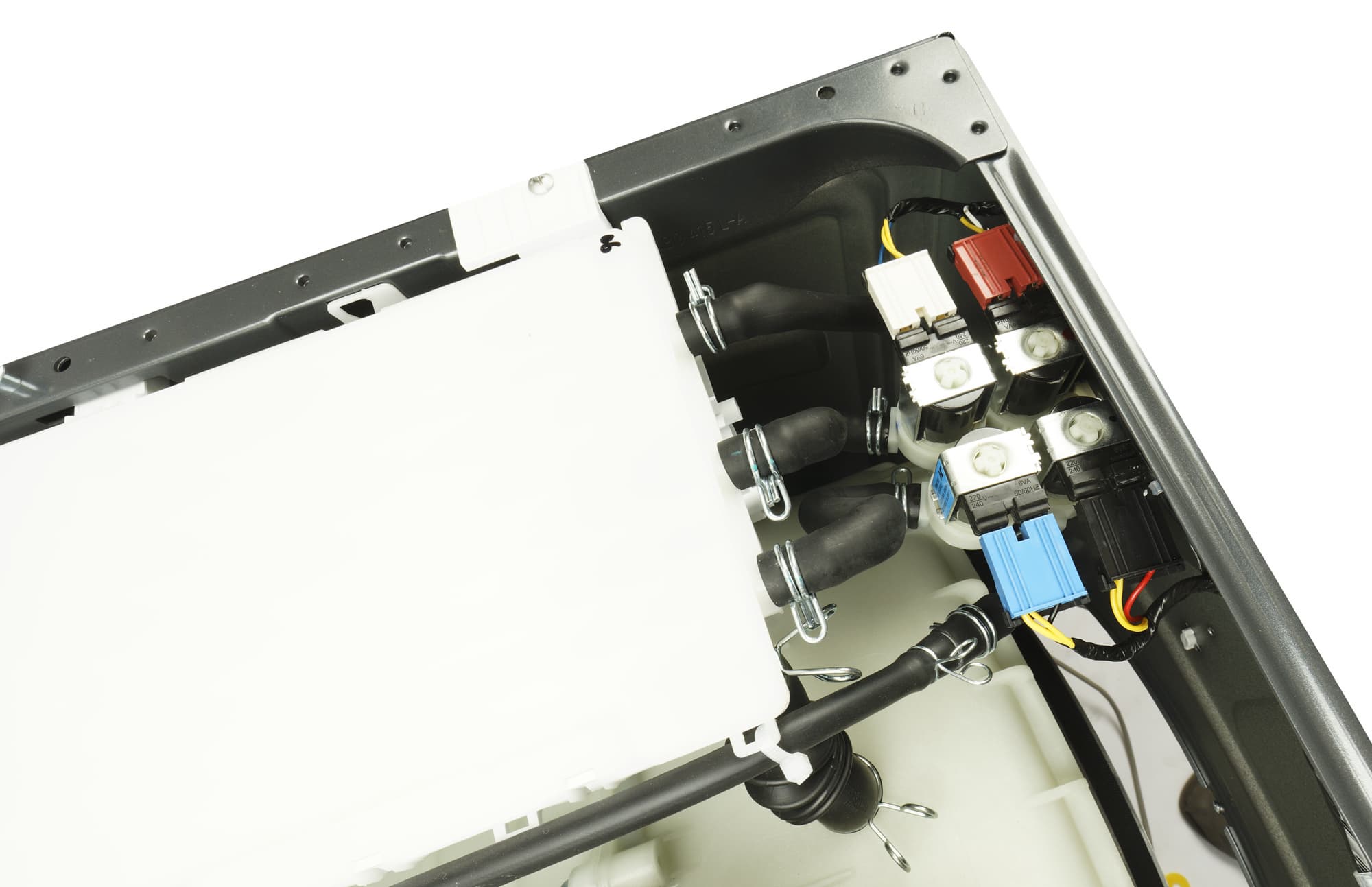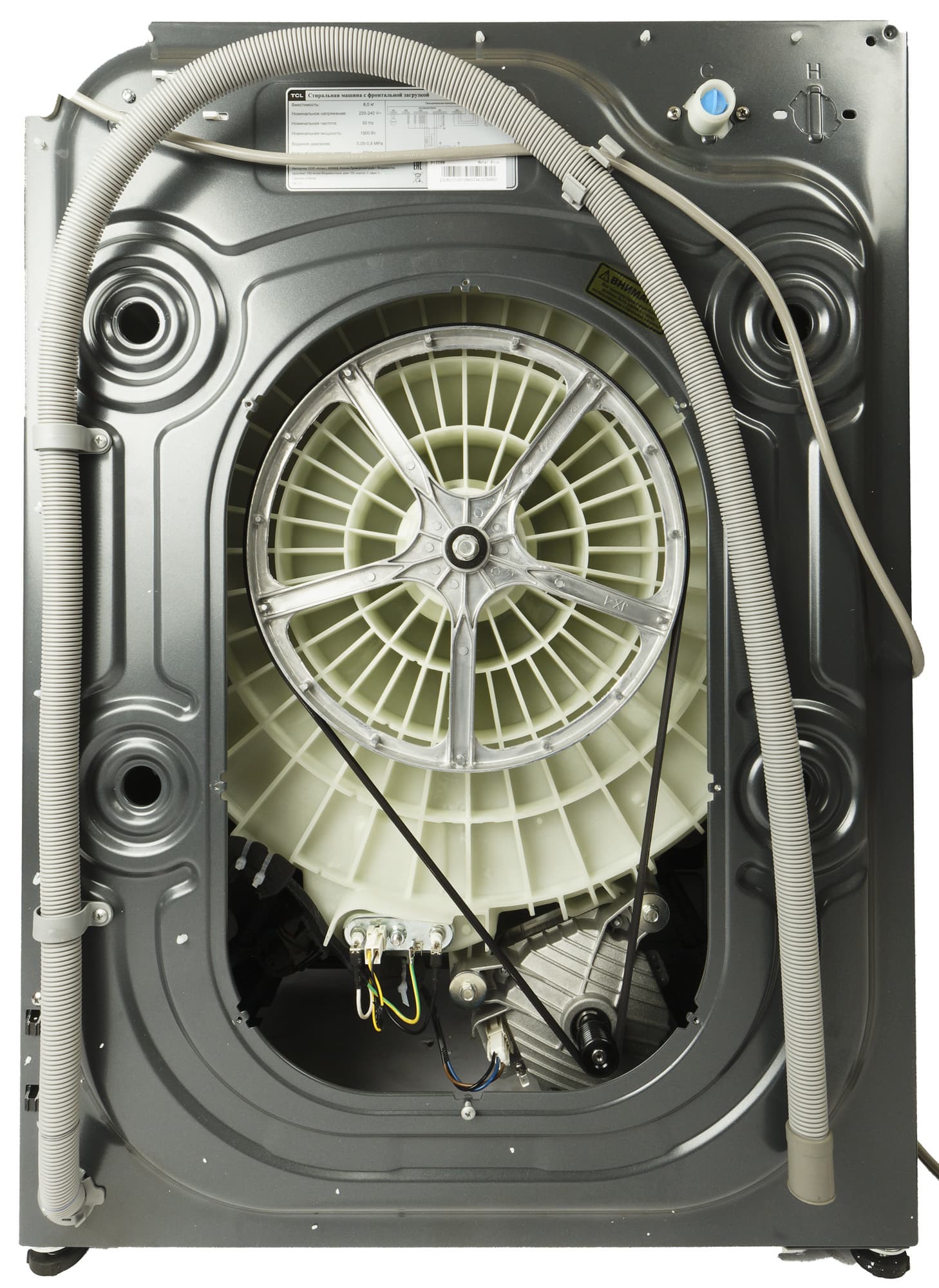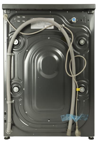 Верхняя крышка — пластиковая. К задней стенке пластиковыми клипсами крепятся несъемный сливной шланг и электропровод с евровилкой. Заливной же шланг прикручивается к пластиковой водорозетке в правом верхнем углу. В транспортировочном положении барабан удерживается четырьмя винтами с массивными резиновыми шайбами: их перед первым включением следует вывинтить и удалить.