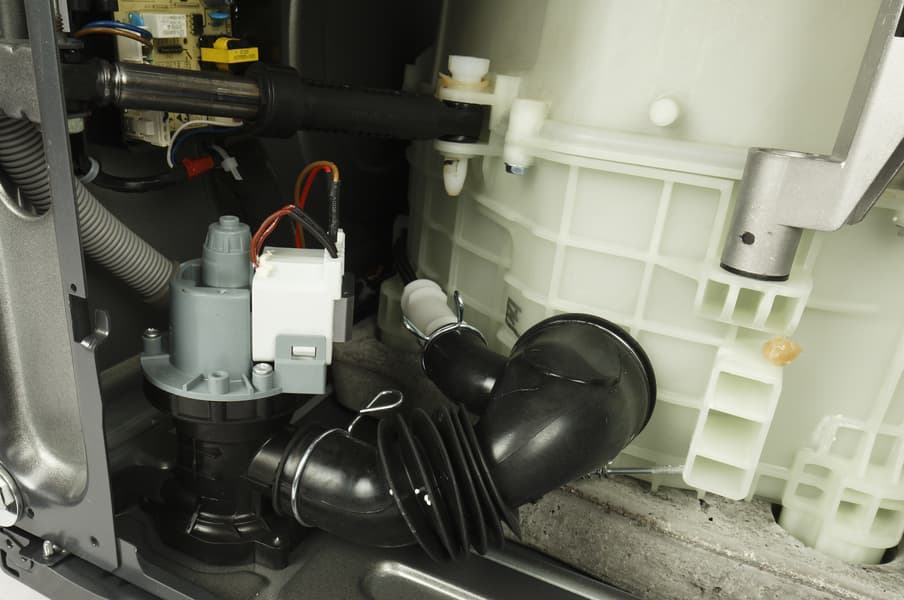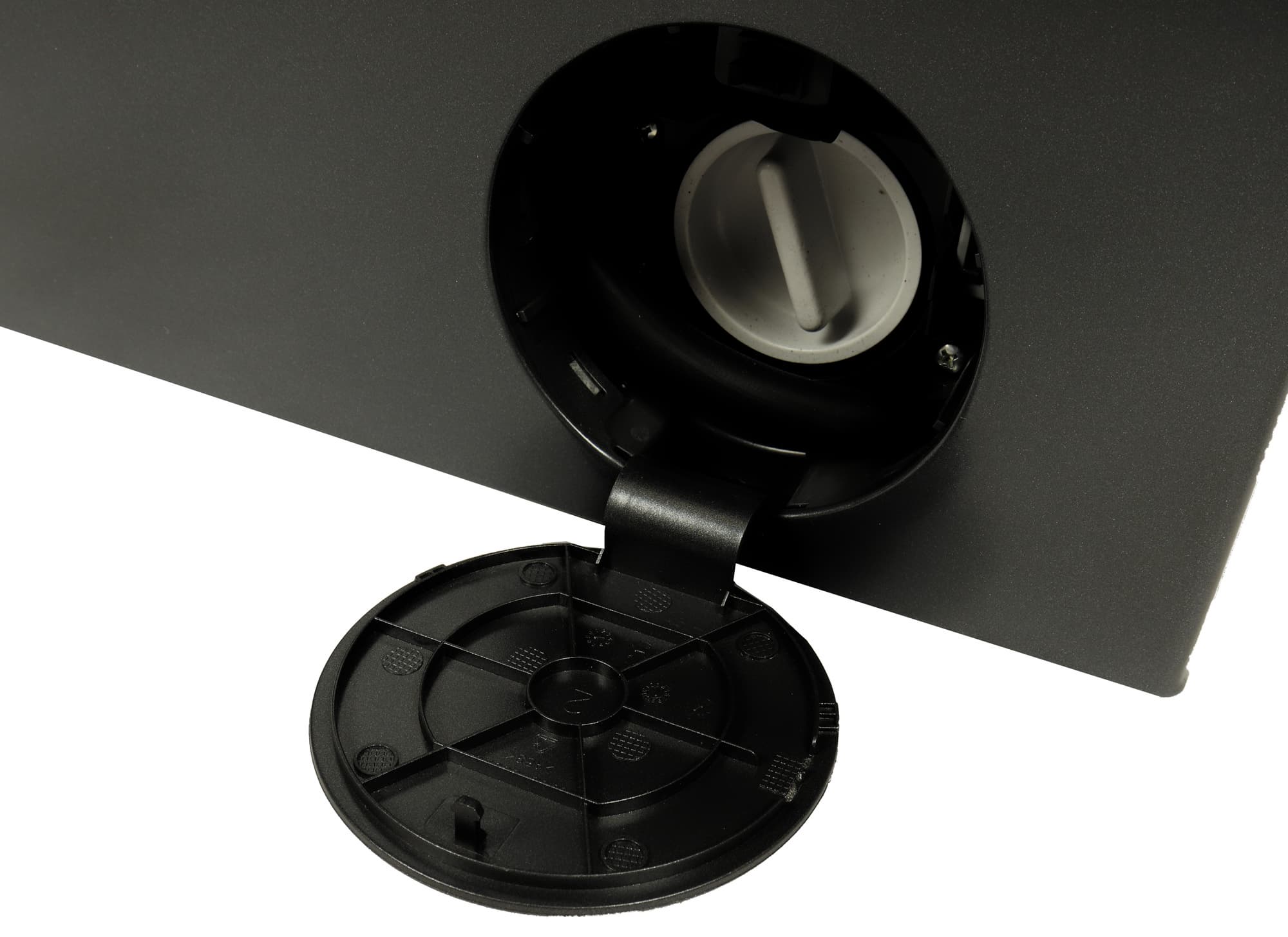 В нижнем правом углу передней панели можно видеть круглый пластиковый лючок, под которым скрывается пробка выпускного фильтра.