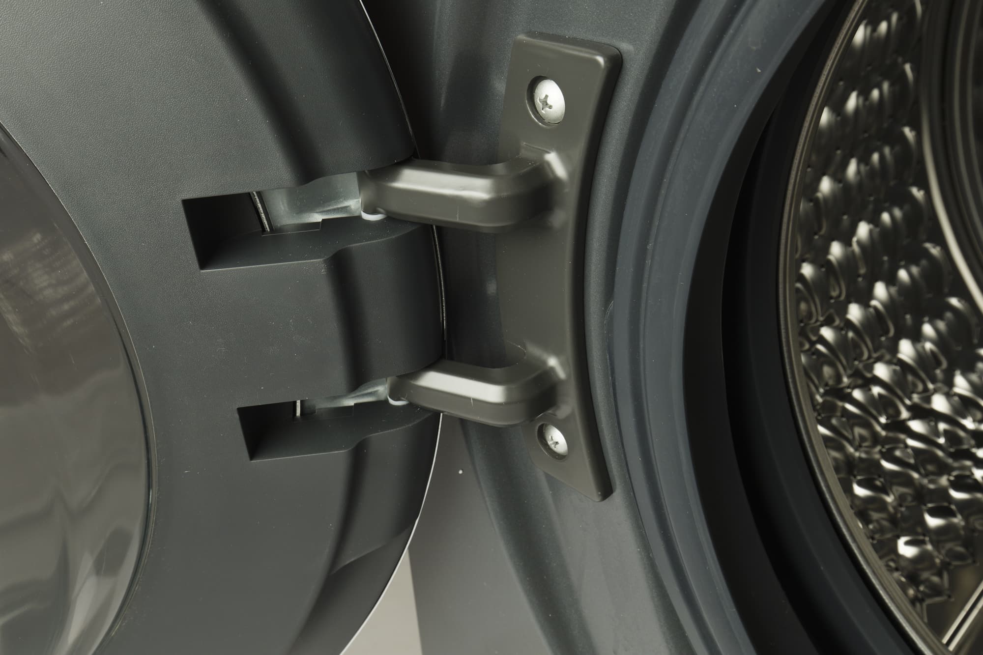 Петли крышки люка металлические, окрашенные в цвет корпуса. Сама крышка — двухслойная: стеклянная внутренняя часть закрыта декоративным пластиковым колпаком темного цвета.