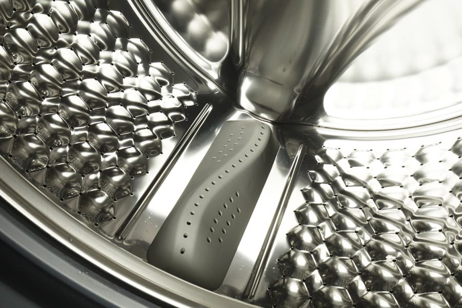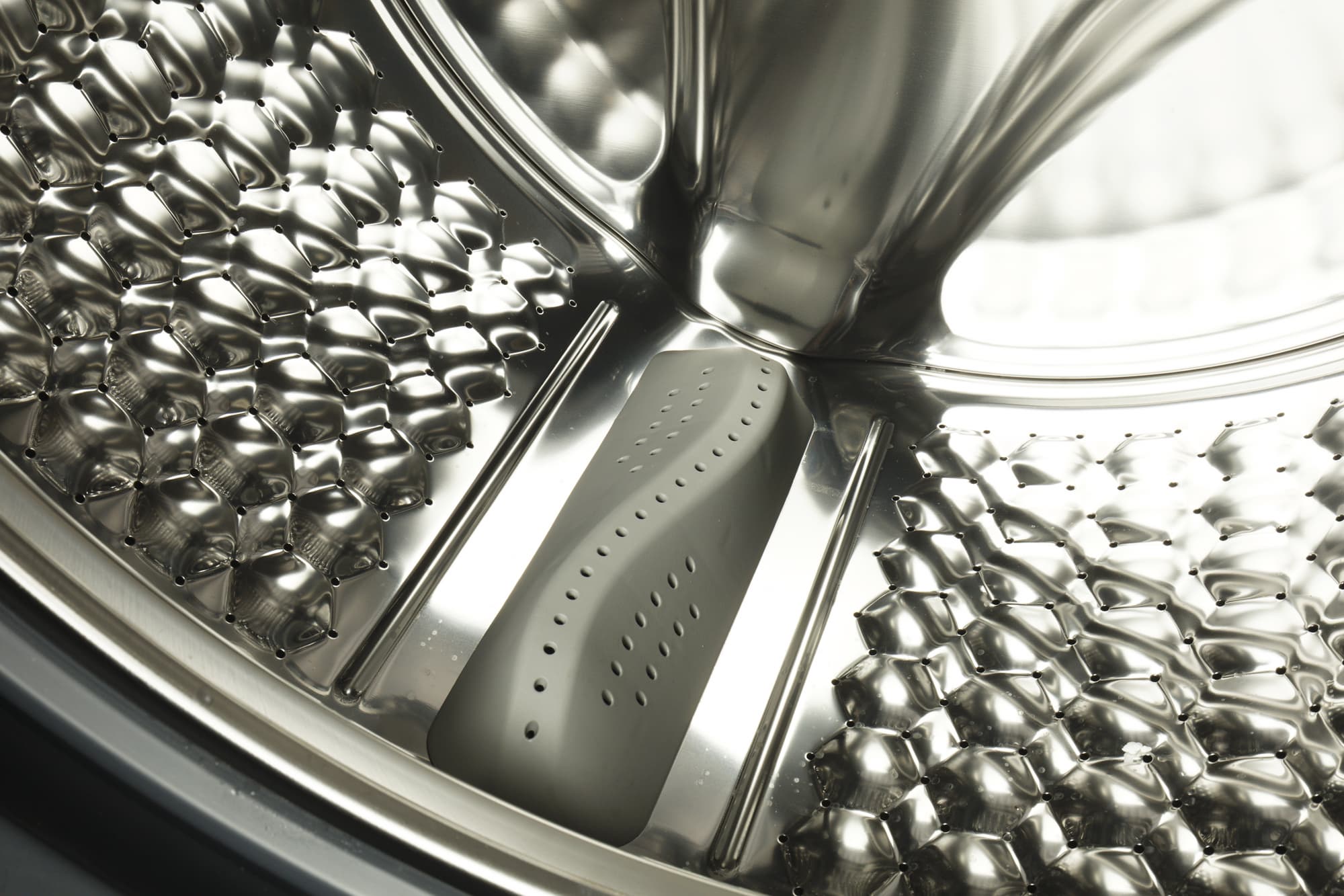 Внутренняя поверхность барабана украшена штамповкой в форме выпуклых шестиугольников, в углах которых проделаны отверстия для циркуляции воды. Пластиковые бойники плавно изогнуты и также с отверстиями.