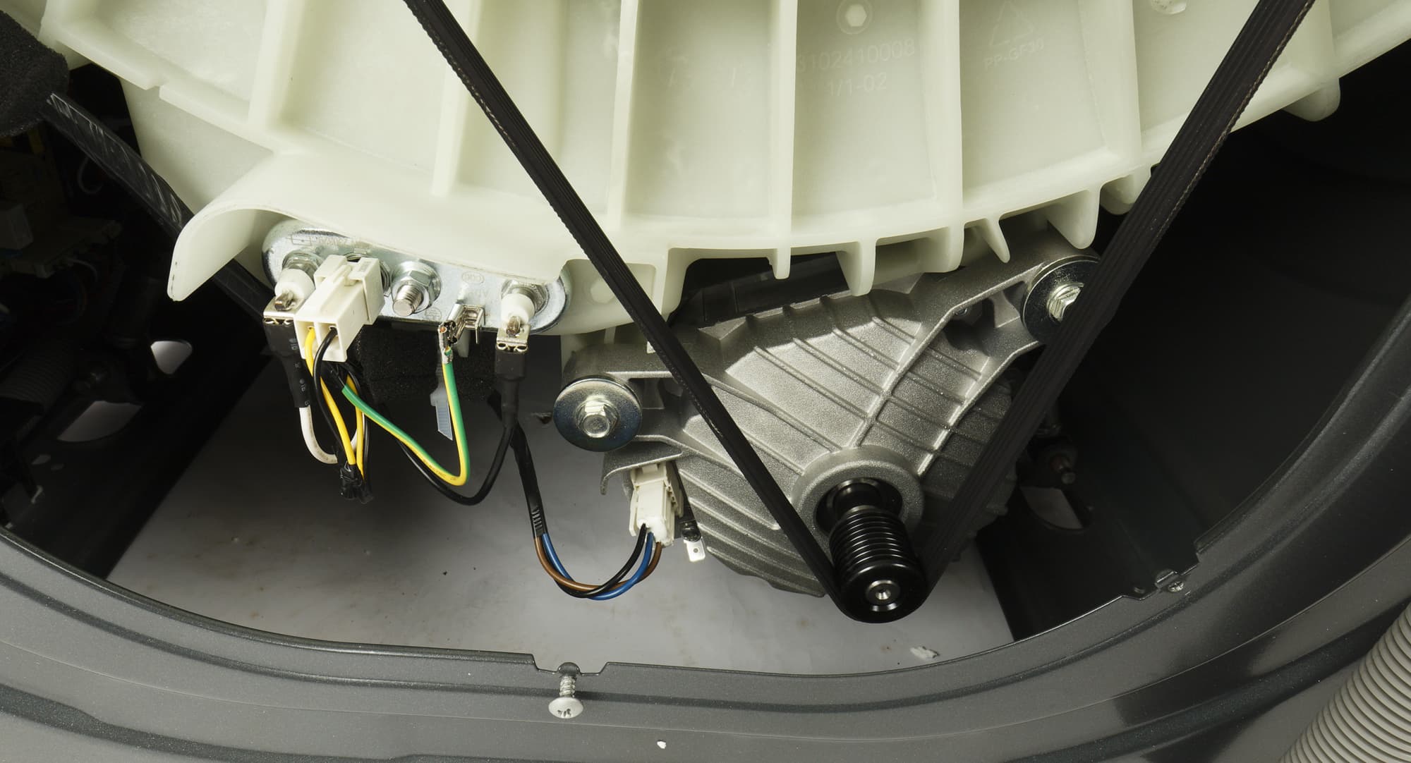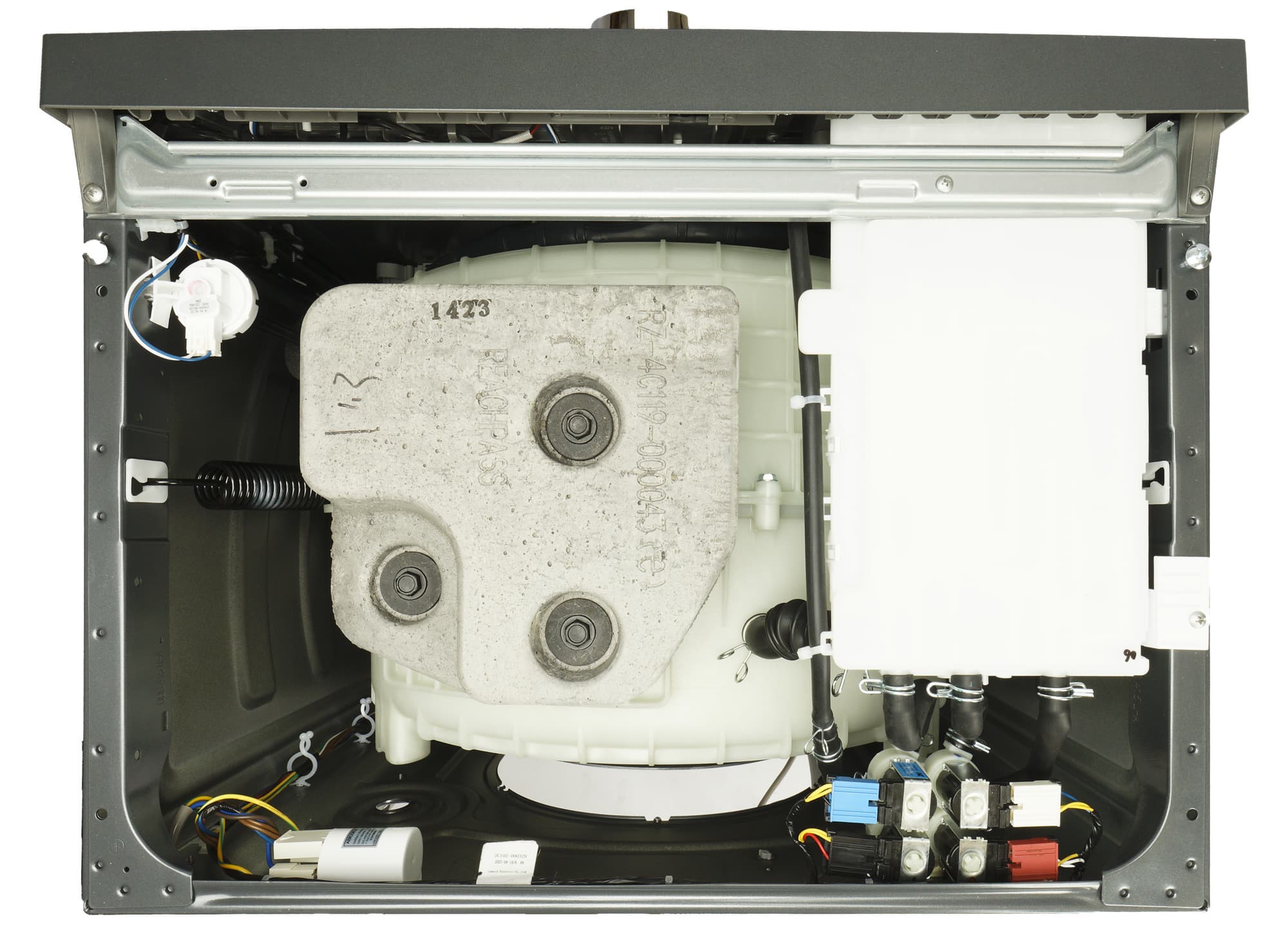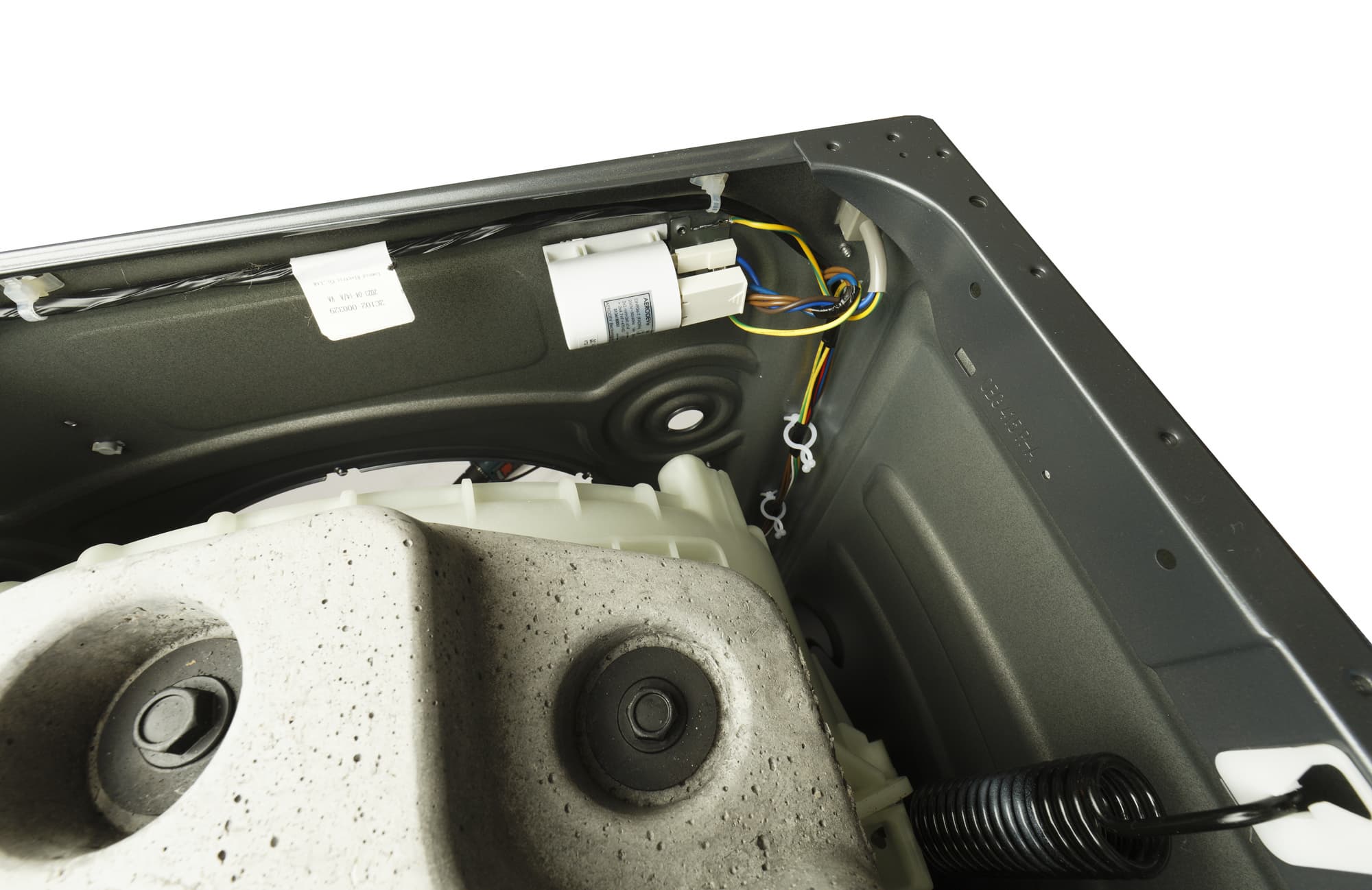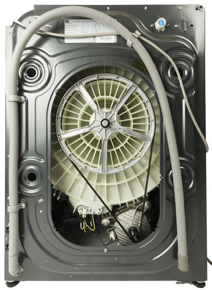 По уже сложившейся традиции мы проводим неполную разборку стиральной машины, снимая верхнюю пластиковую панель и заднюю крышку, и фотографируем агрегат изнутри.