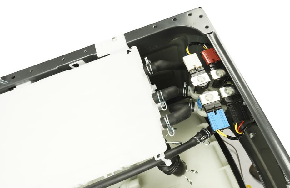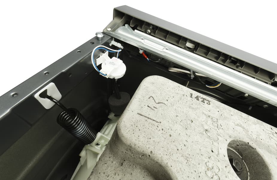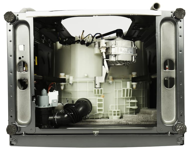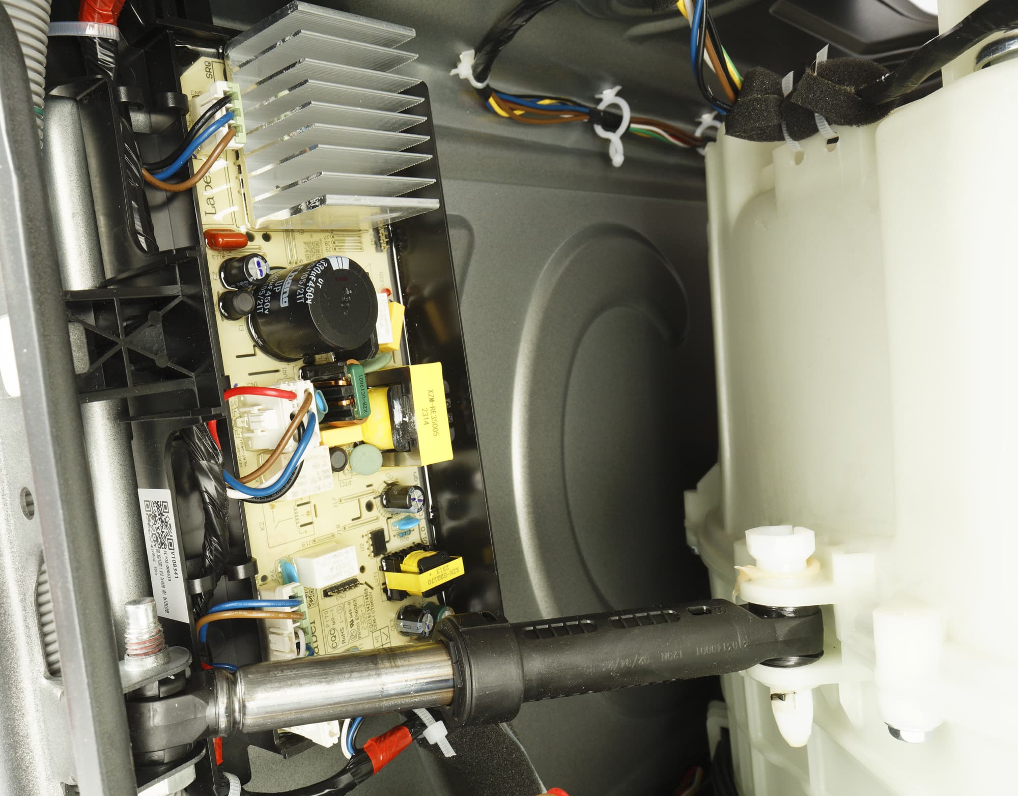 По уже сложившейся традиции мы проводим неполную разборку стиральной машины, снимая верхнюю пластиковую панель и заднюю крышку, и фотографируем агрегат изнутри.