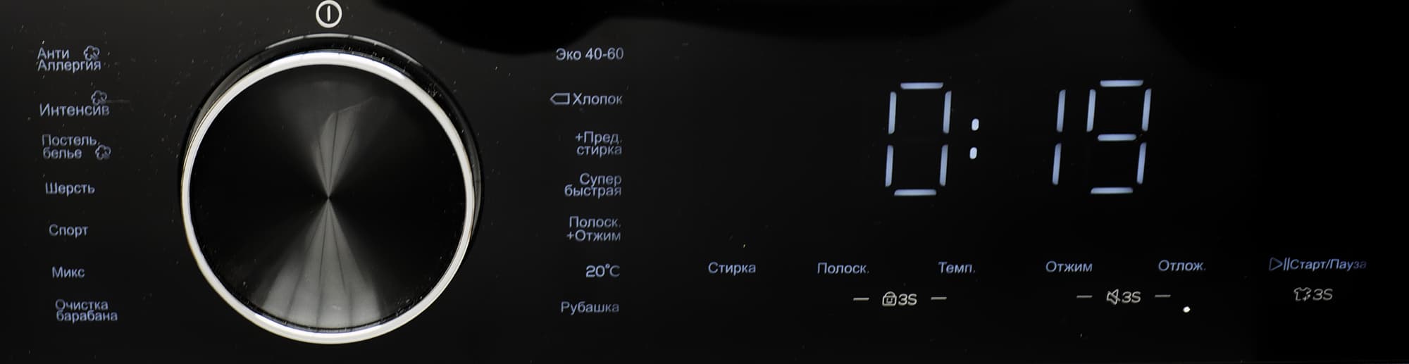 Большие цифры на дисплее отображают прогнозируемое время выполнения сценария, а в процессе стирки — часы и минуты до конца цикла. Под цифровым дисплеем расположены сенсорные кнопки, управляющие дополнительными опциями.