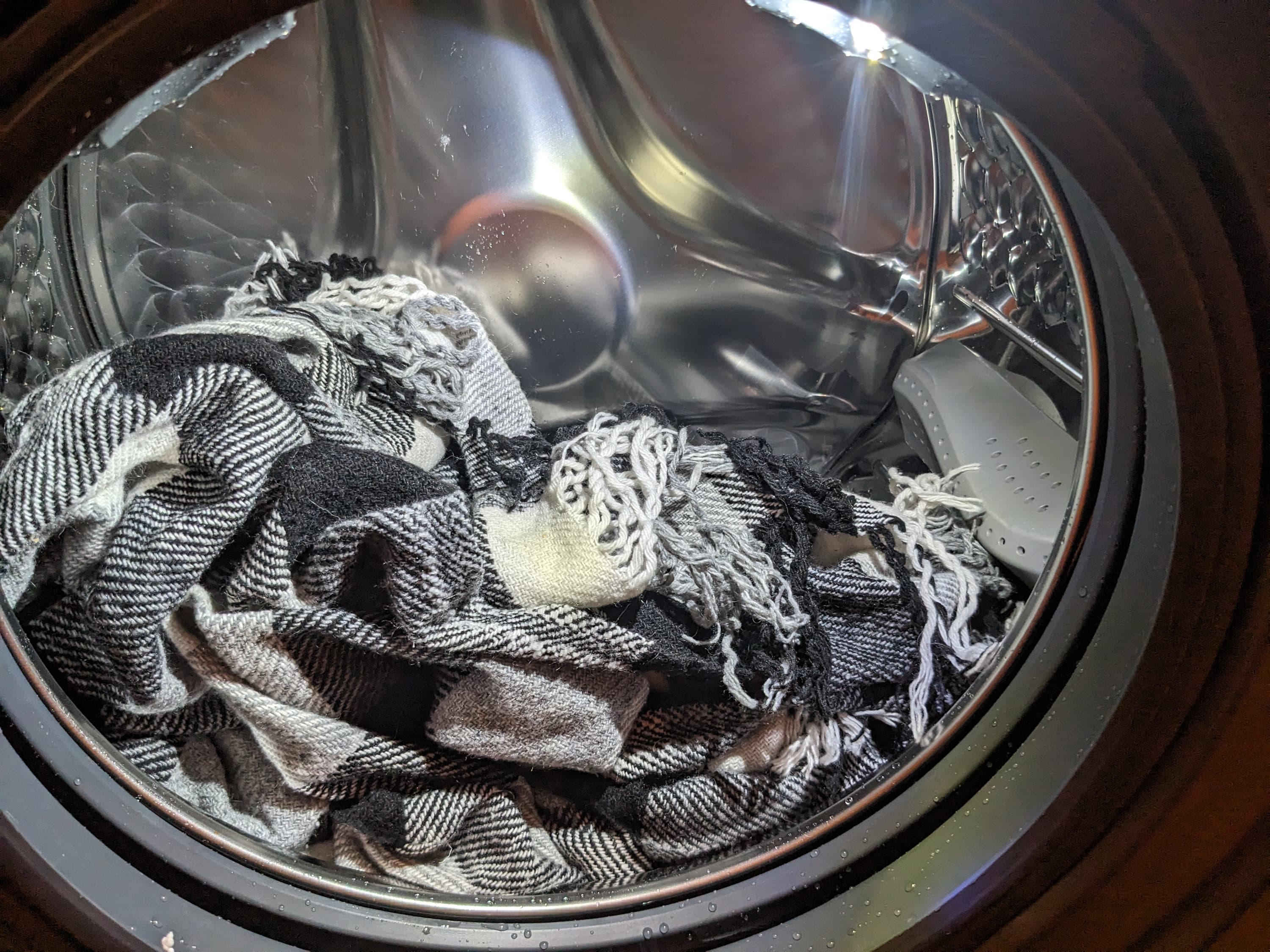 Конечно, в стиральную машину кладут не только хлопок, поэтому в наши обязательные тесты входит и стирка шерсти — одной из наиболее деликатных тканей. Мы взяли наш любимый плед весом около килограмма и постирали его на программе для шерсти с установками по умолчанию (без нагрева воды, отжим 400 оборотов в минуту) специальным жидким средством.