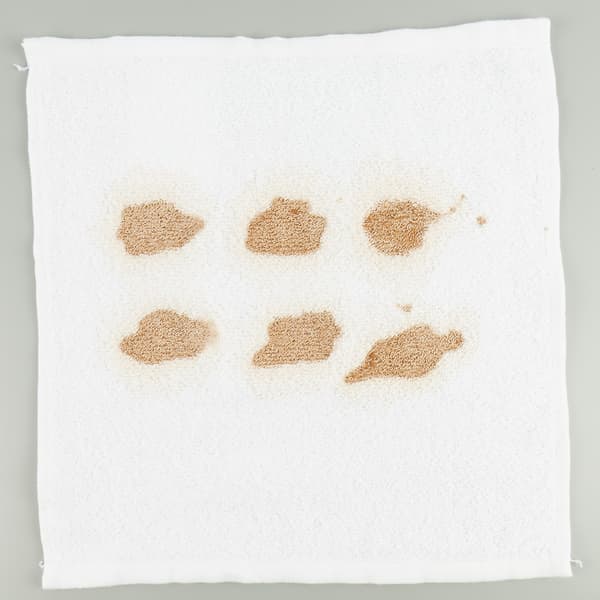 Чтобы оценить, насколько хорошо эта модель стирает, мы взяли комплект белых махровых салфеток и запятнали их часто встречающимися и трудно отстирываемыми органическими загрязнениями.