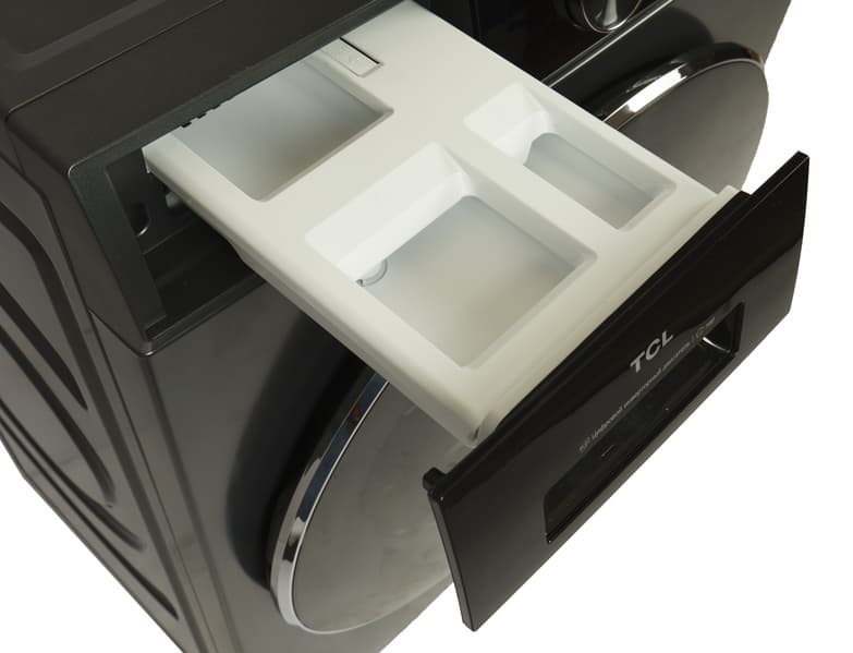 Выдвижной лоток для моющих средств, как у большинства стиралок, с тремя отделениями, но расположены они по-другому. Слева — отсеки для порошка и геля: спереди, ближе к пользователю — для предварительной стирки, а чуть дальше — для основной. Ванночка справа предназначена для кондиционера.