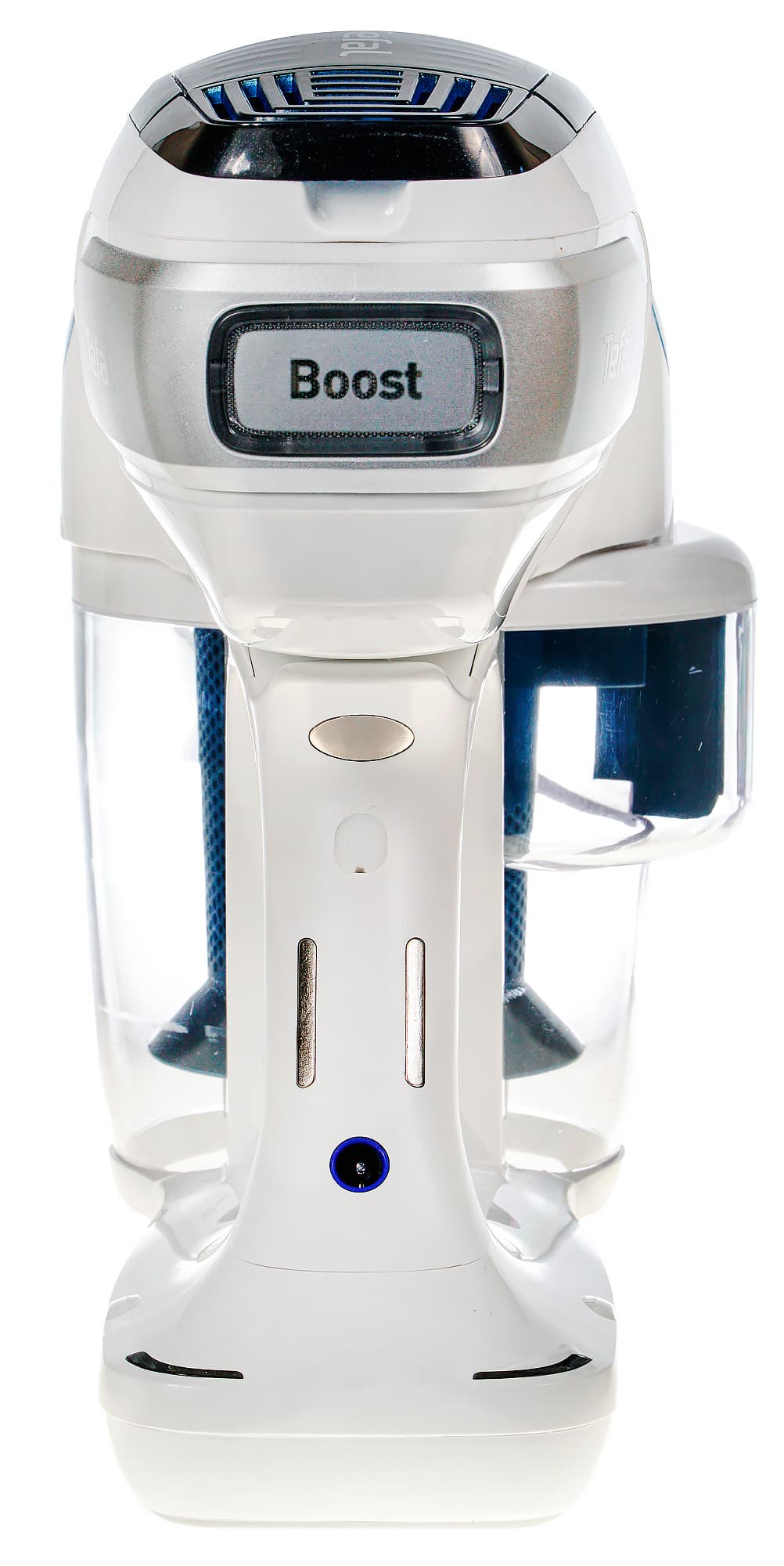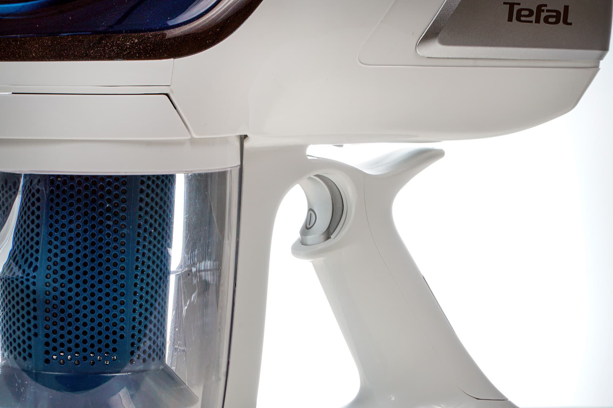 А вот турборежим включается и выключается нажатием на большую кнопку с соответствующей надписью в тыльной части корпуса. Смело, ярко, по-дизайнерски... но не очень удобно: той рукой, что держишь пылесос, турборежим не включить.