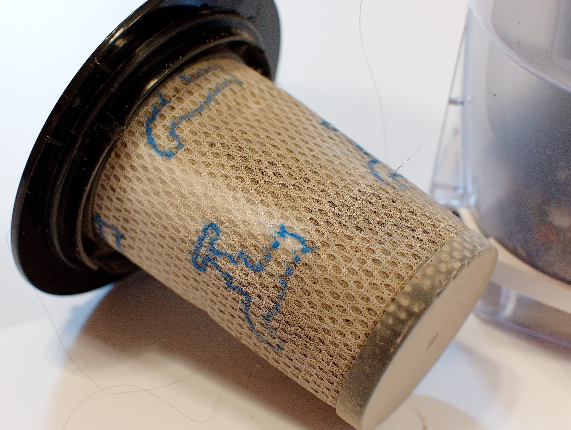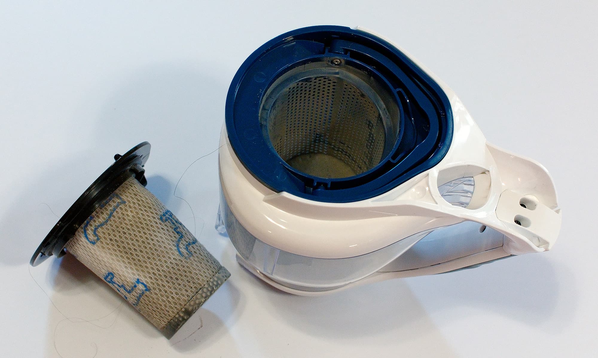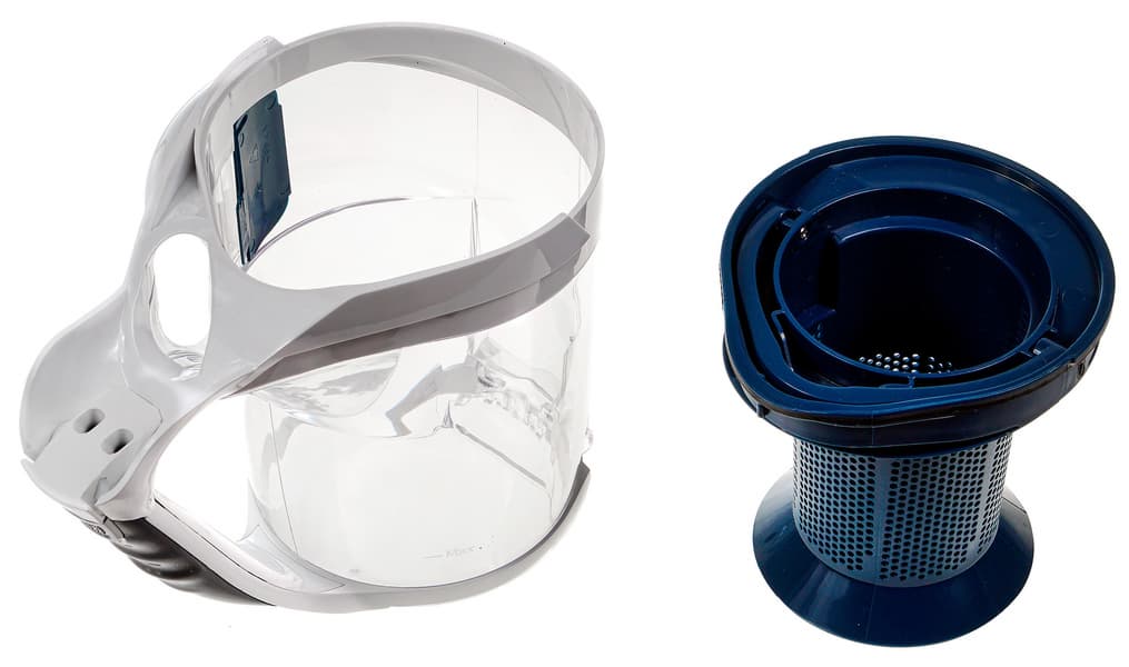 Фильтр из микроволокна (их в комплекте идет два) вставляется внутрь синего циклона, а потом сам циклон — внутрь прозрачного бака пылесборника.